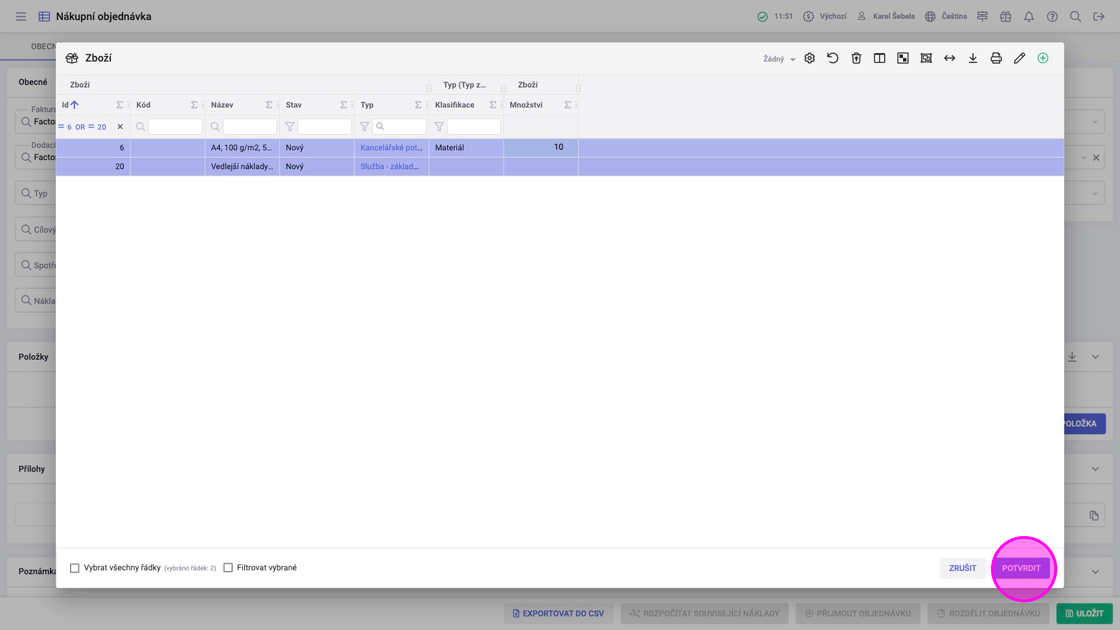 4. Ze seznamu položek vybrat jednu nebo více položek, které chcete přidat do nákupní objednávky.