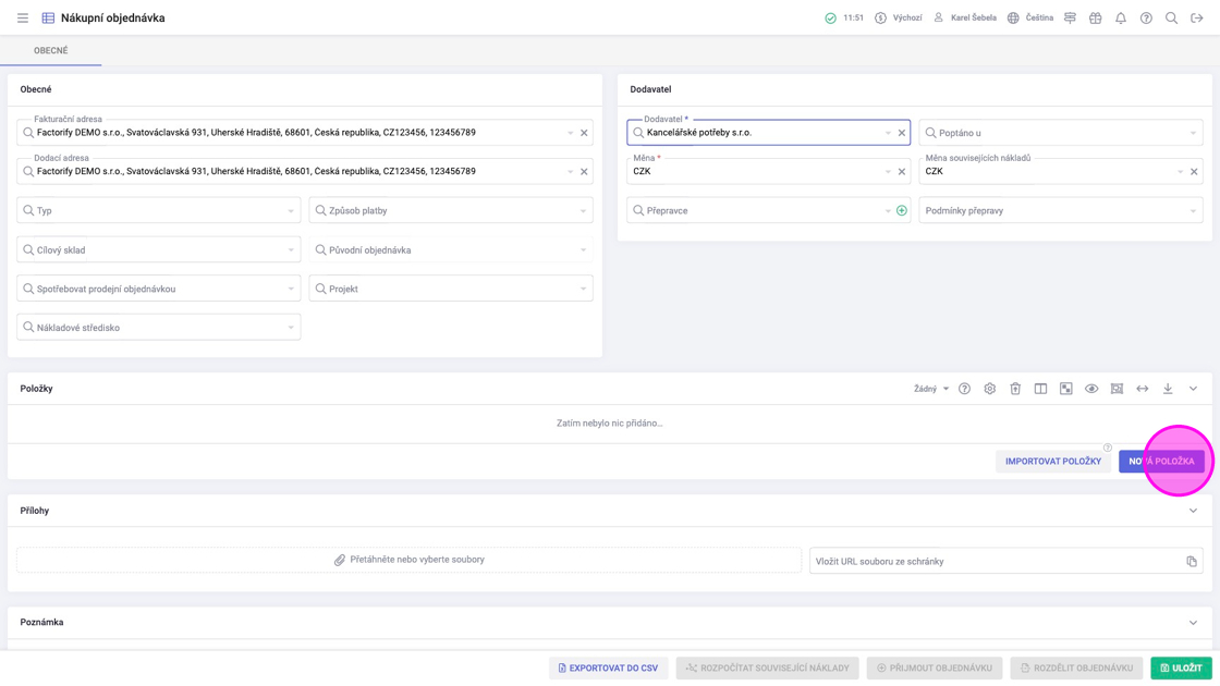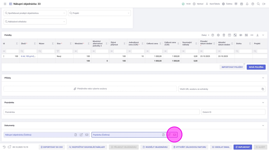 Nebo použít zkratku Ctrl+mezera a napsat zkratku „po n“. (purchase order new)