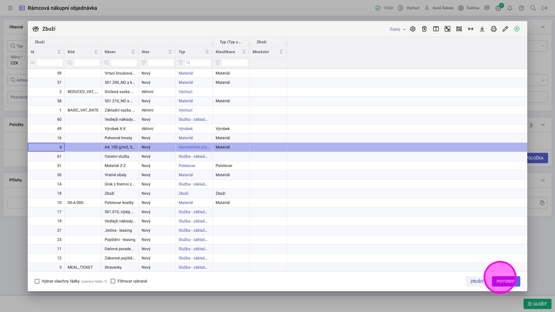 Tip: Rámcová objednávka ve stavu „objednáno“ a „potvrzeno“ se již bude nabízet v nákupních objednávkách k čerpání.