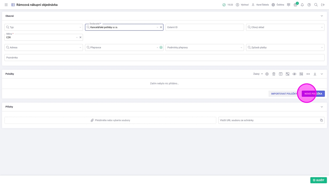 3. Vybrat položky, které chcete poptávat, pomocí tlačítka "Nová položka". Postupovat stejně jako při vytváření standardní nákupní objednávky.