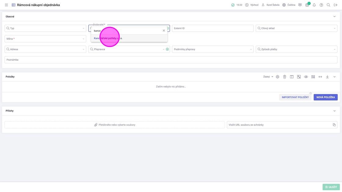 2. Kliknout na pole "Dodavatel" a vybrat dodavatele.