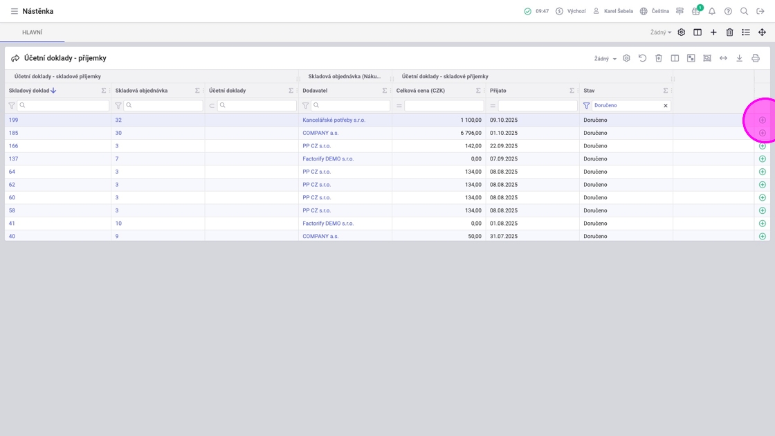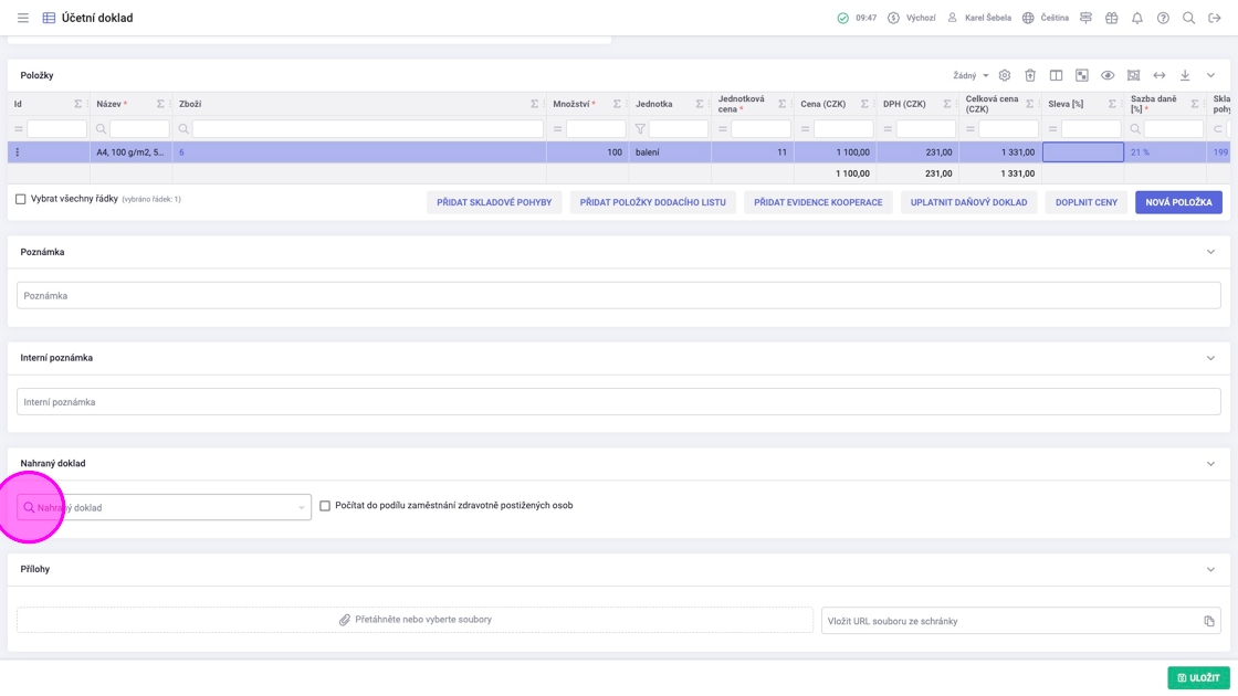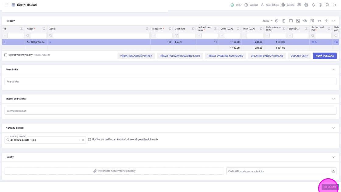 Ukážeme si postup, jak založit přijatou fakturu poté, co nám přišla e-mailem, systém ji automaticky zařadil do agendy „Nahrané doklady“ a skladník naskladnil zboží, čímž nám založil příjemku do systému.