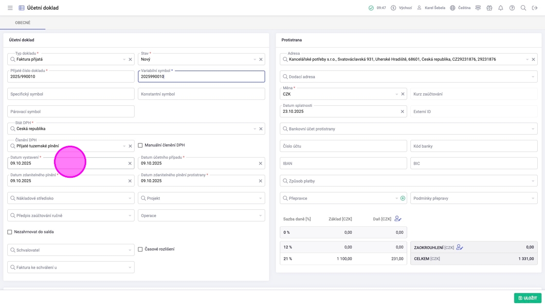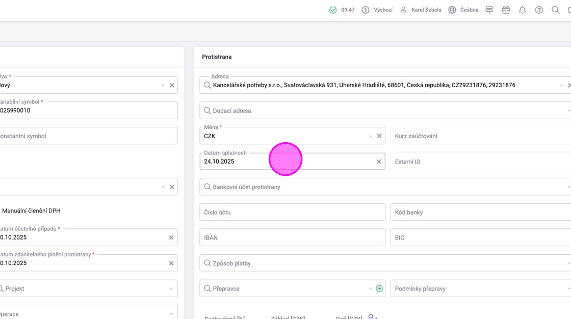 5. Systém automaticky spočítal datum splatnosti z datumu vystavení + hodnota nastavená na kartě dodavatele „Výchozí splatnost nákupu“. Opravit, pokud nesouhlasí s fakturou.