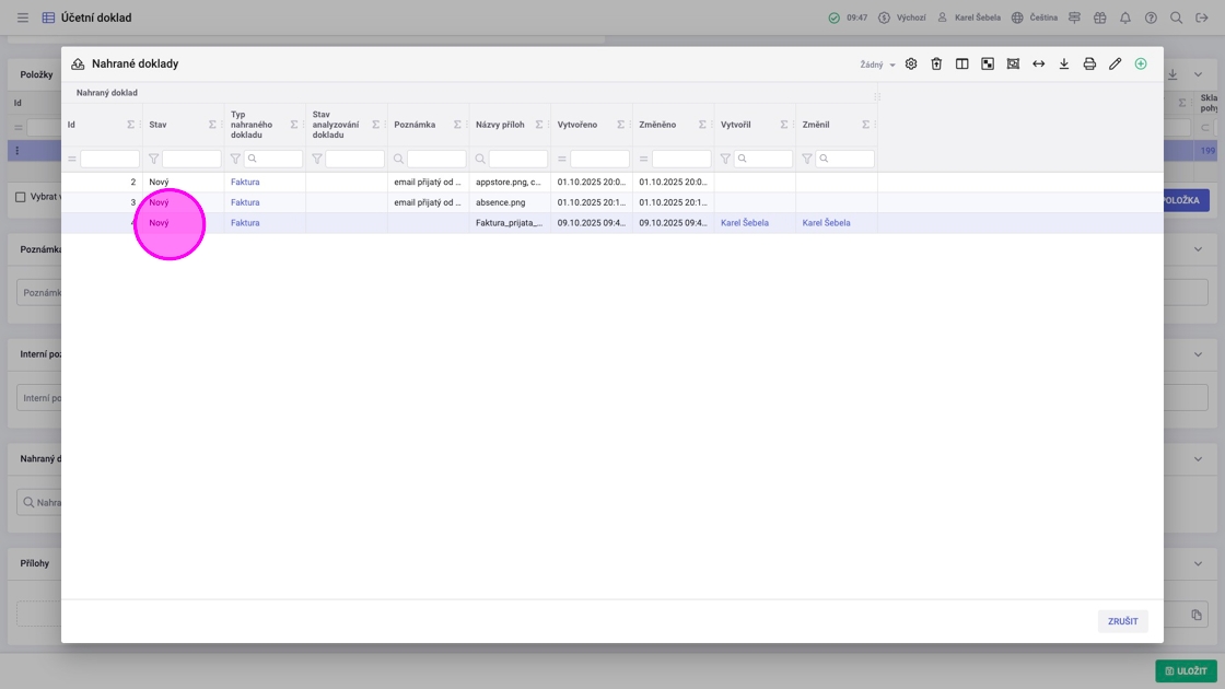 8. Vybrat odpovídající nahraný doklad kliknutím na řádek. Tím se přenese sken faktury k založené přijaté faktuře.