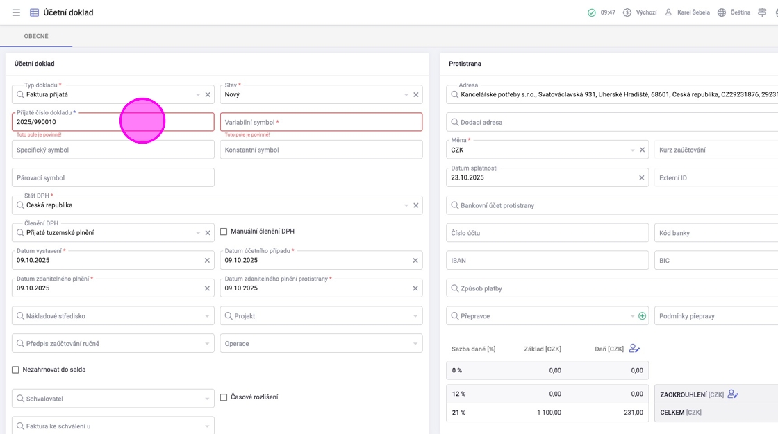2. Opsat hodnotu z faktury do políčka „Přijaté číslo dokladu“.