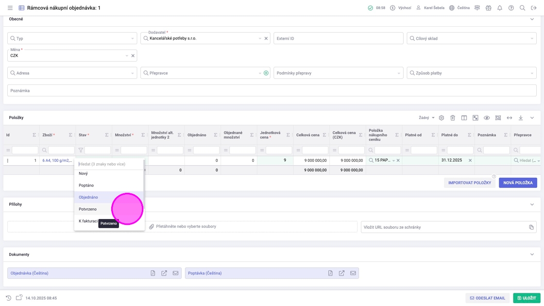 10. Poté, co si s dodavatelem odsouhlasíte množství, ceny a všechny smluvní podmínky rámcové objednávky, přepněte ručně na stav „Potvrzeno“.