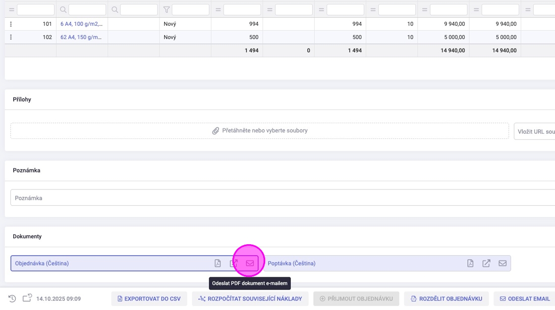 7. Kliknout na poštovní obálku „Objednávka“. Odešlete objednávku danému dodavateli a stav nákupní objednávky se automaticky přepne na „Objednáno“.