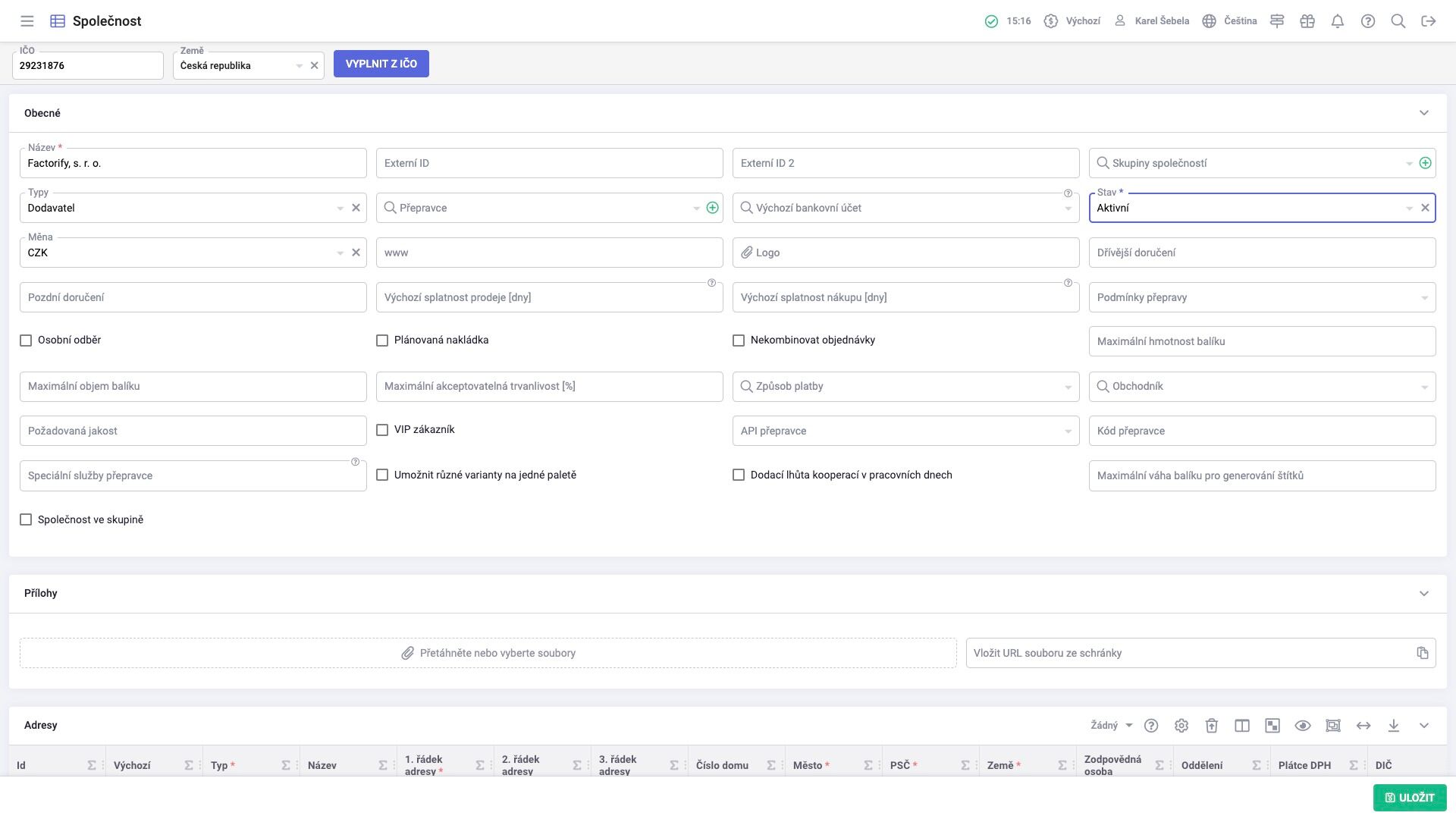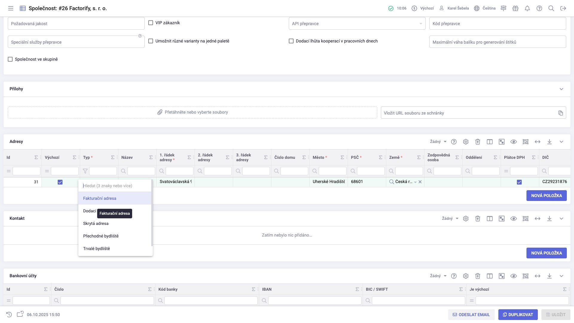 5. Pokud se společnost přestěhovala, změnila adresu nebo jiný údaj (například status plátce/neplátce DPH, stát, IČO nebo DIČ), původní adresa se v systému ponechává, protože je již použita na existujících účetních dokladech. Je třeba u těchto adres zaškrtnout, že jsou neplatné, a založit nový záznam s adresou a platnými údaji, které budou od tohoto okamžiku automaticky nabízeny v účetních dokladech.