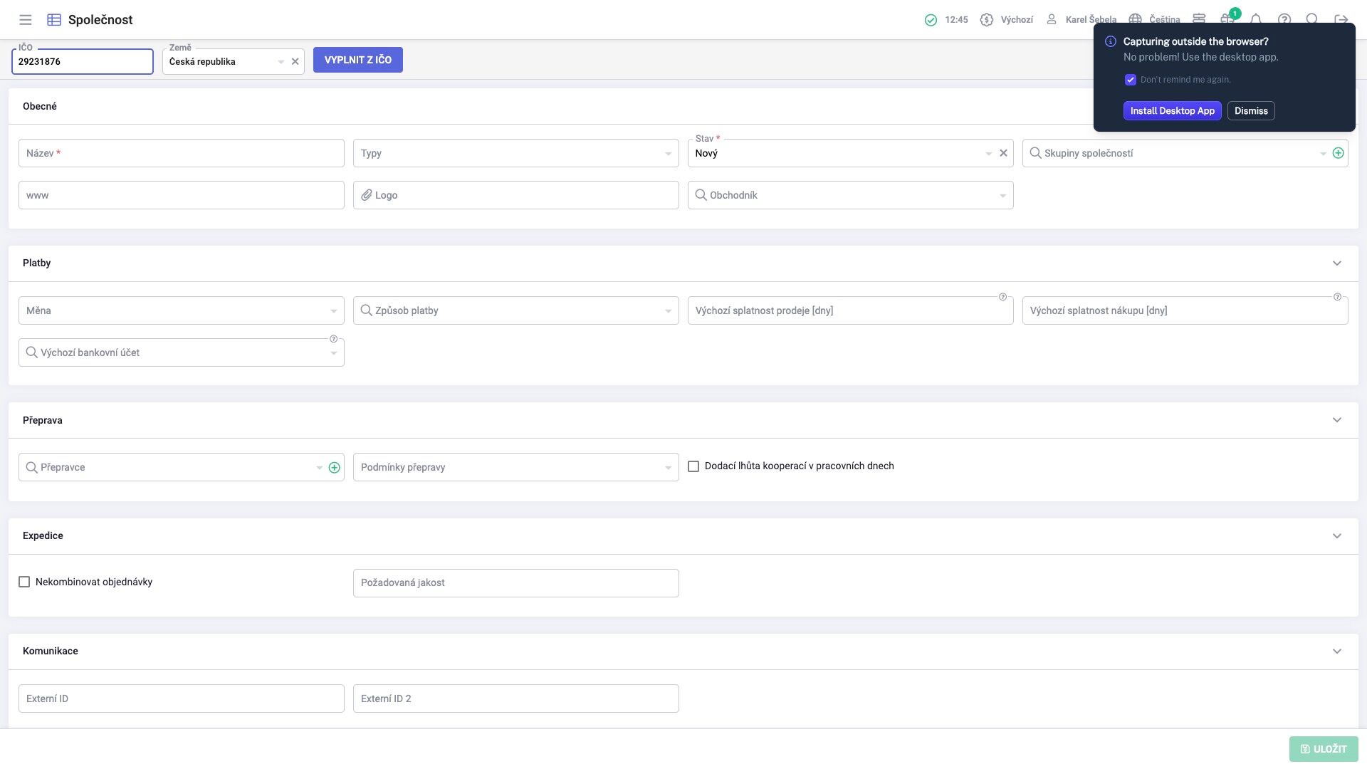 2. Pro rychlé založení společnosti lze využít funkci automatického stažení dat z obchodního rejstříku. Momentálně podporované země: ČR, SK. Vyplnit IČO společnosti.