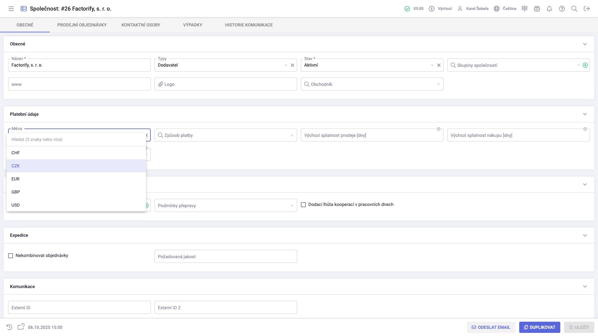 Pokud v agendě společností máte u zákazníka uvedené hodnoty měna, podmínky přepravy, dodací adresa atd., doplní se automaticky.