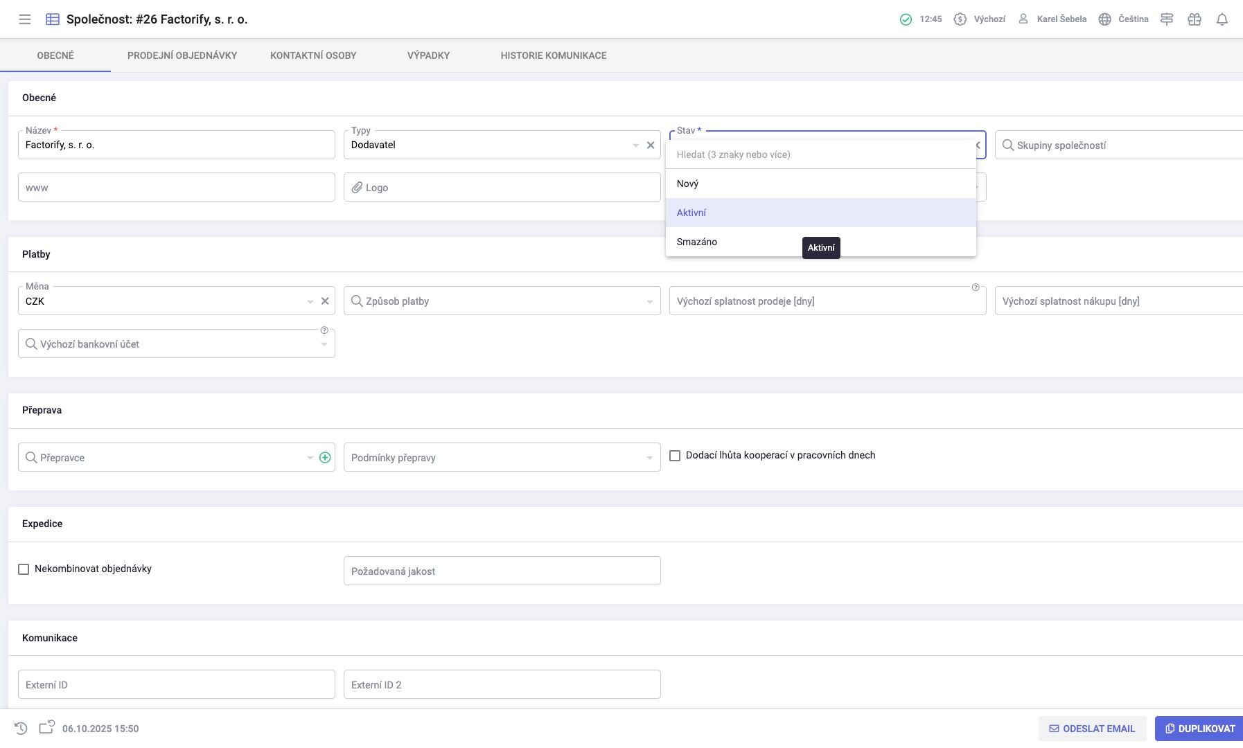 8. Stav "Nový" se nabízí automaticky. Pokud je ve společnosti vše správně vyplněno, vybrat stav "Aktivní".