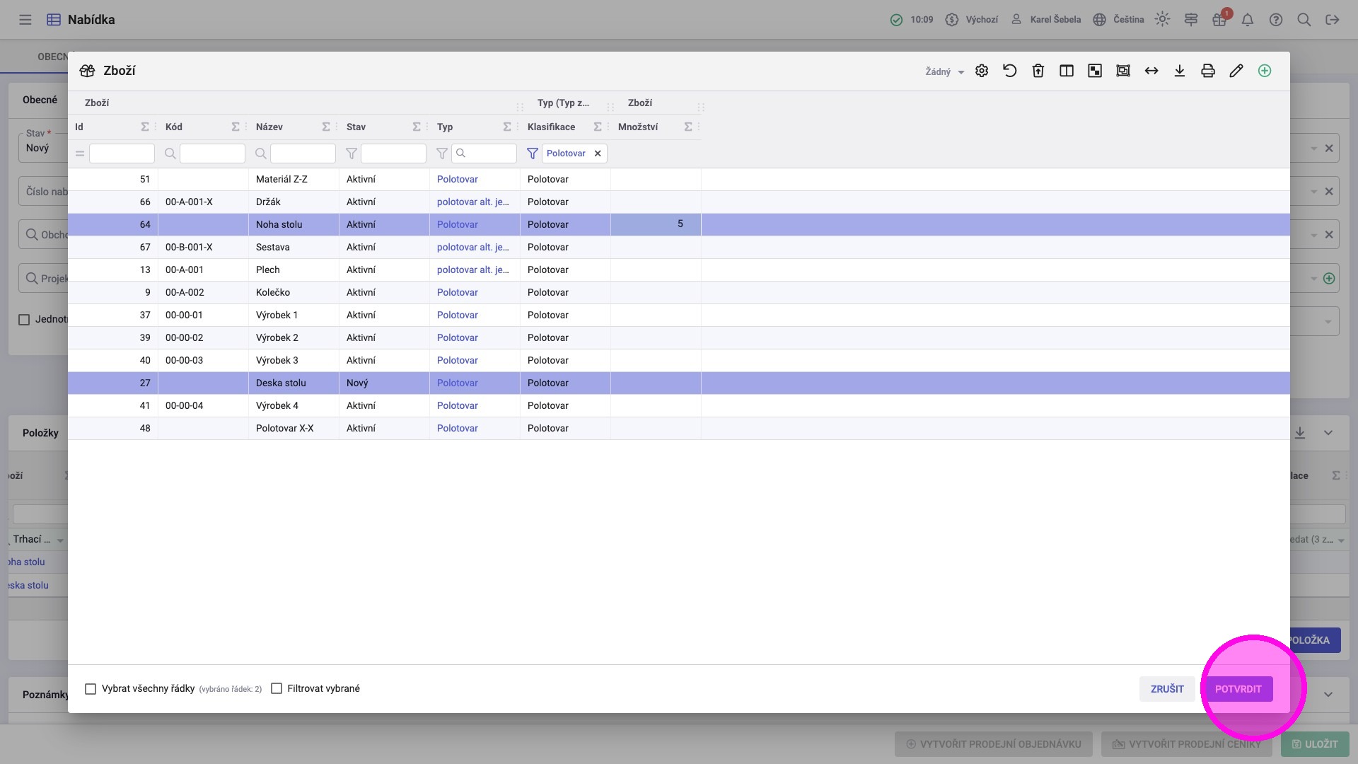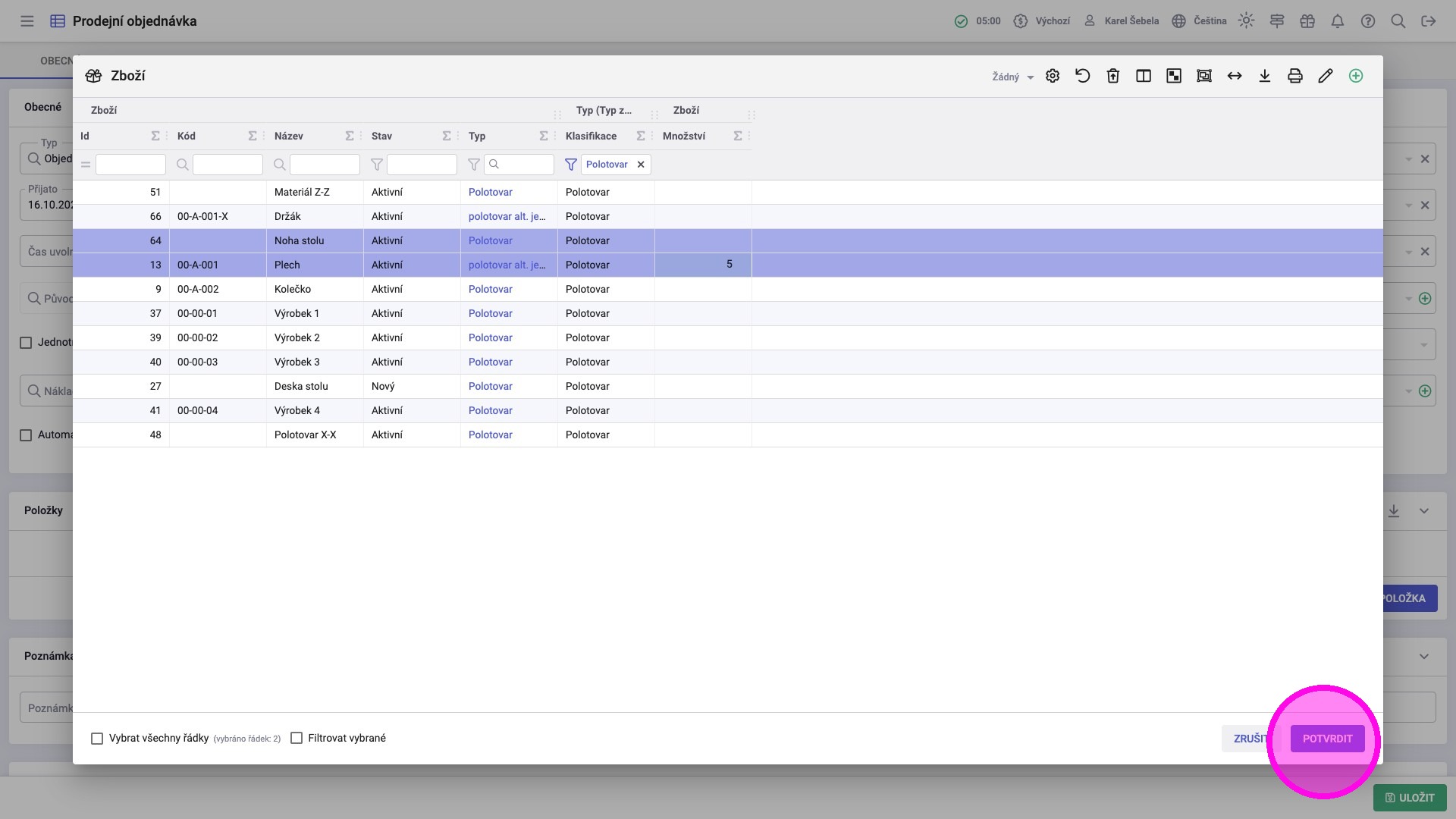 6. Ze seznamu položek vybrat jednu nebo více položek, které chcete přidat do objednávky.