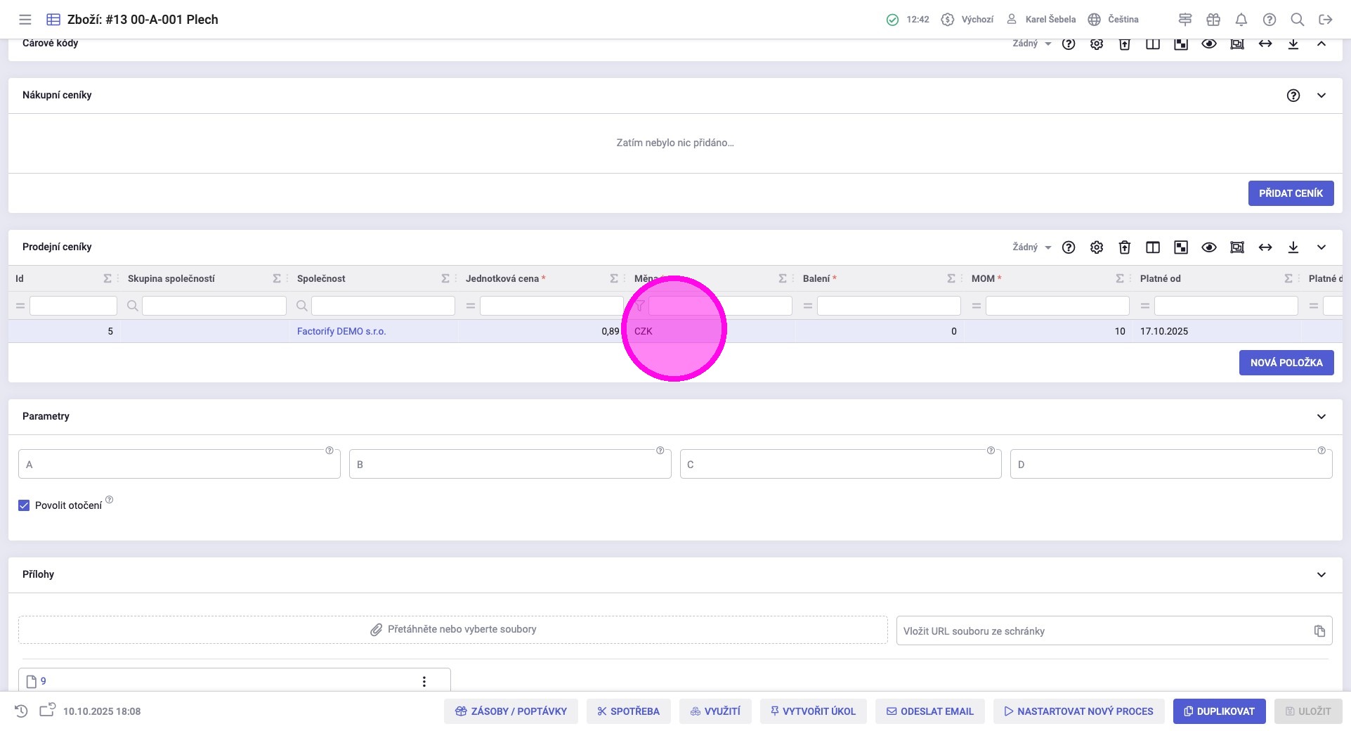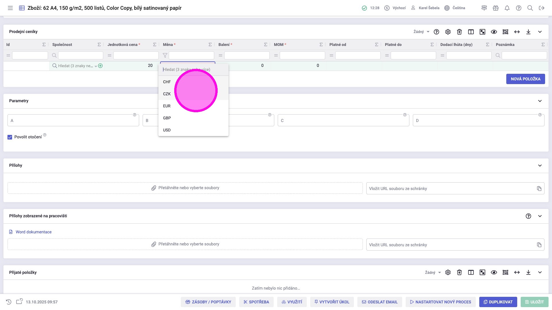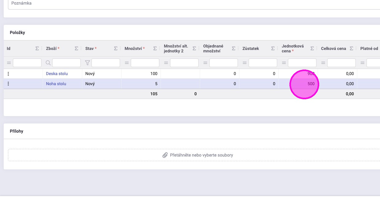 3. Zadat všechna povinná pole. Jednotková cena a měna.