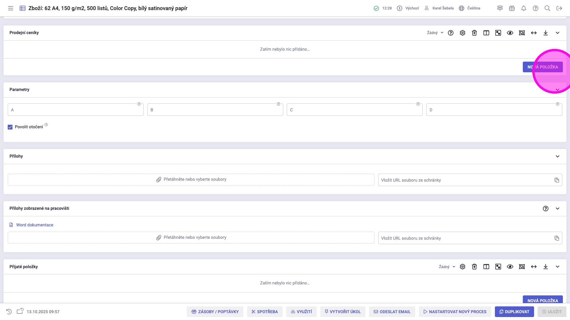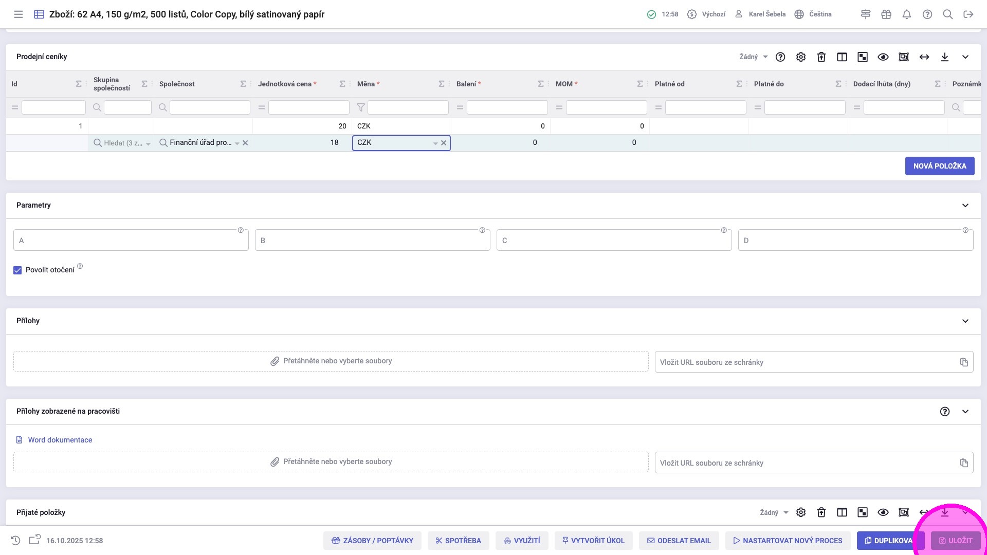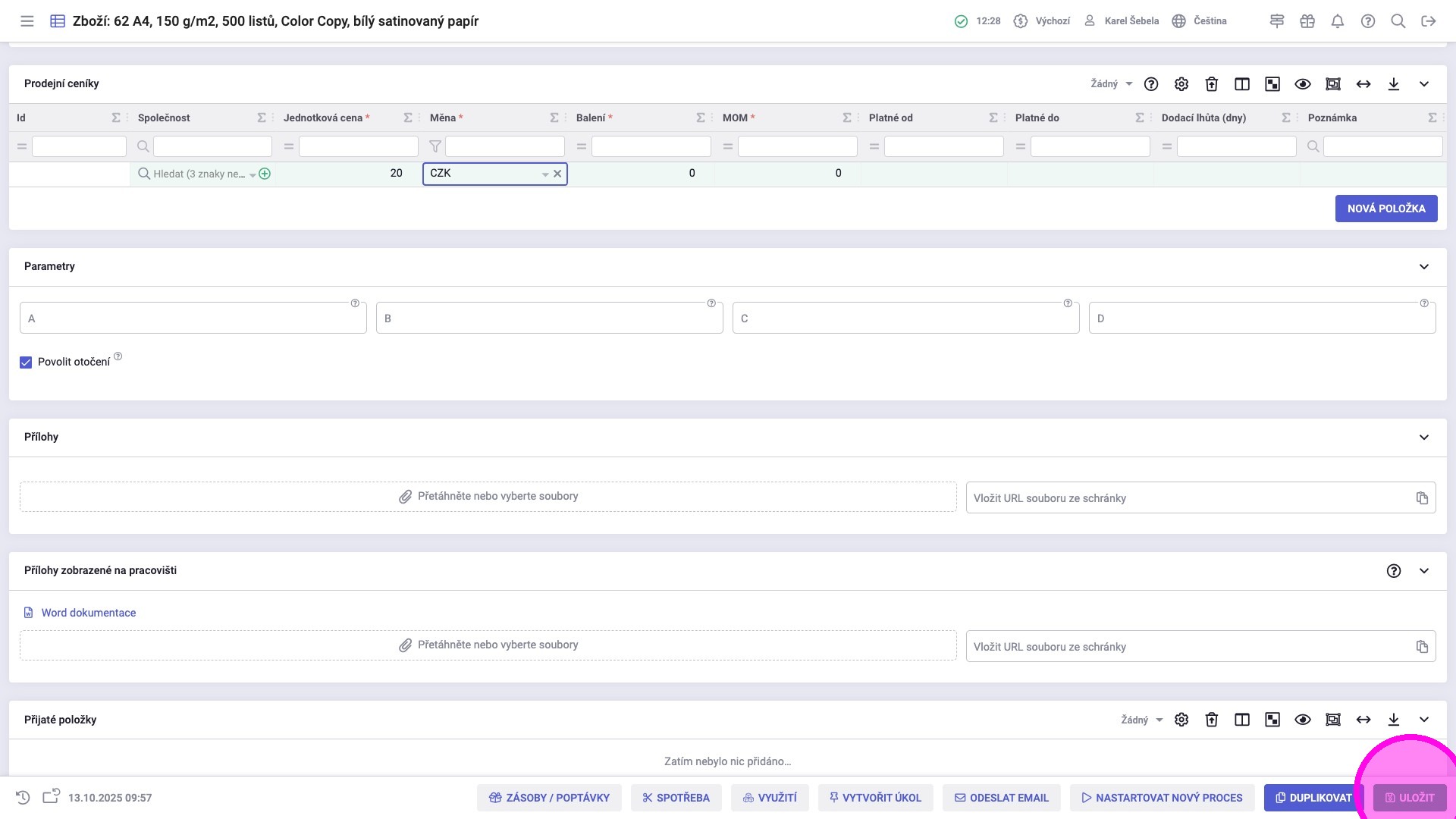 3. Zadat všechna povinná pole. Jednotková cena a měna.