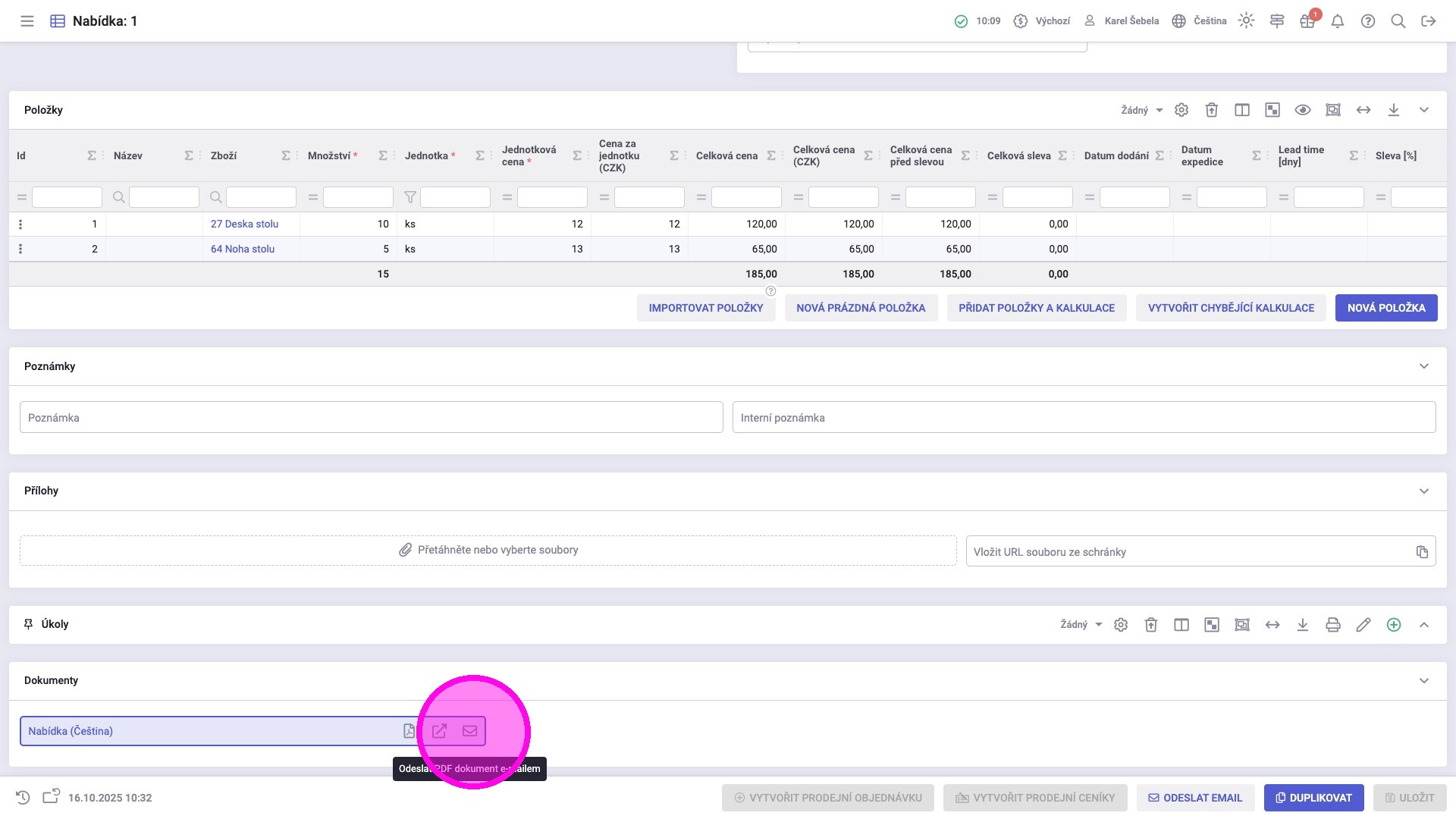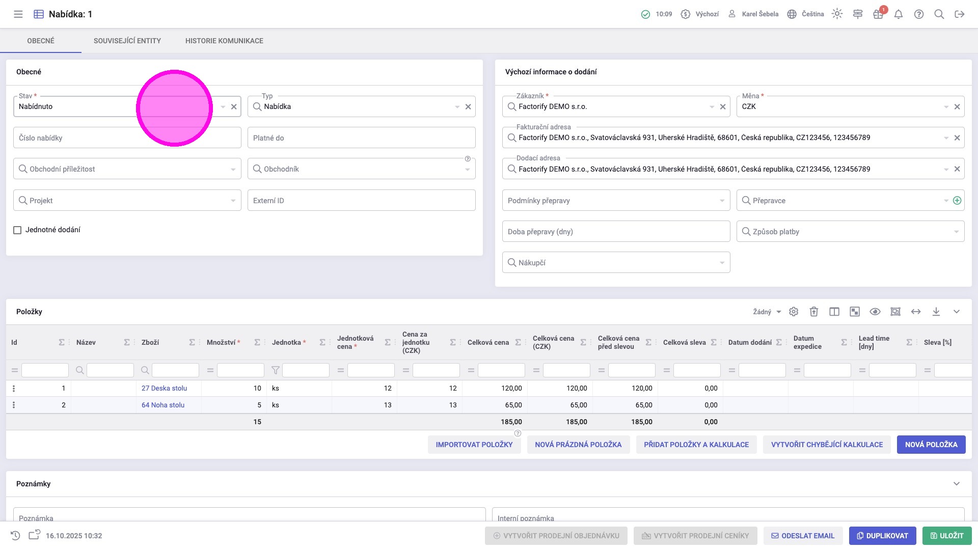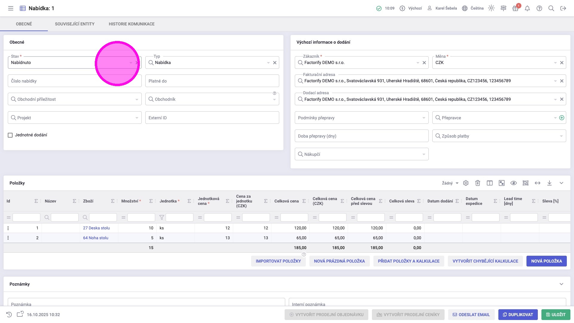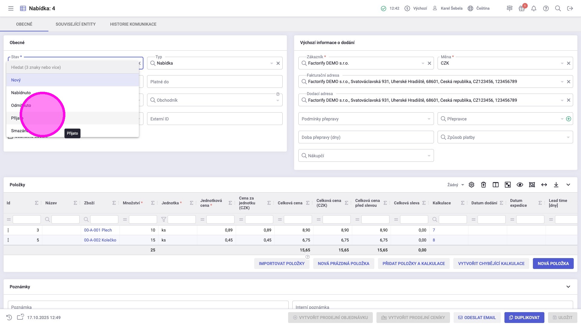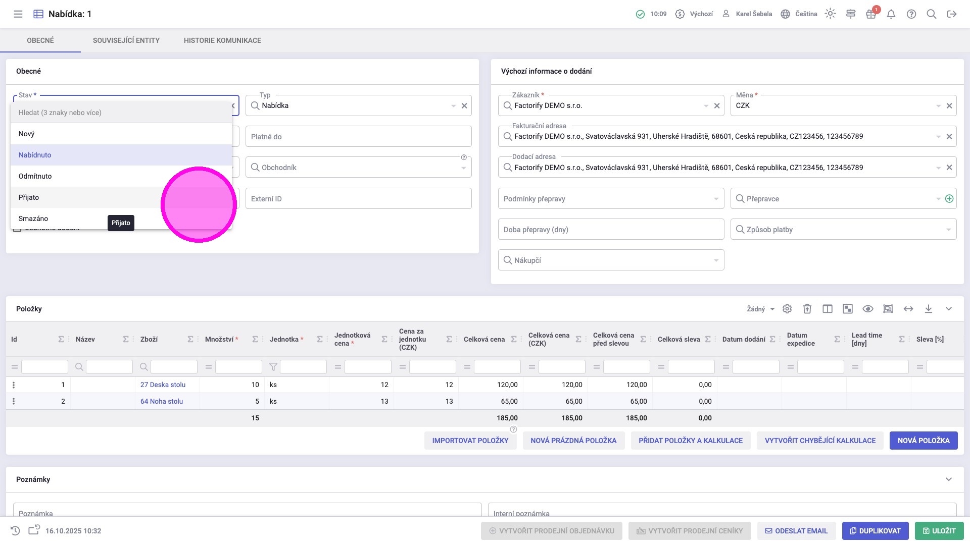 8. Nabídka se automaticky přepne do stavu nabídnuto po odeslání nabídky mailem.
