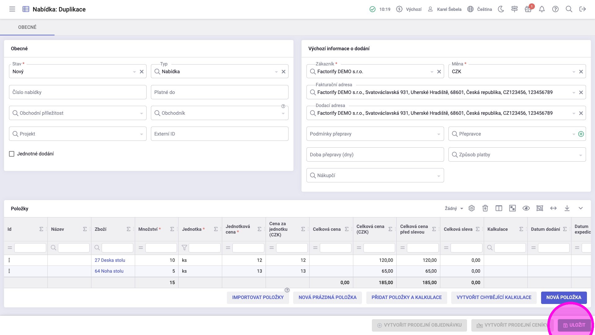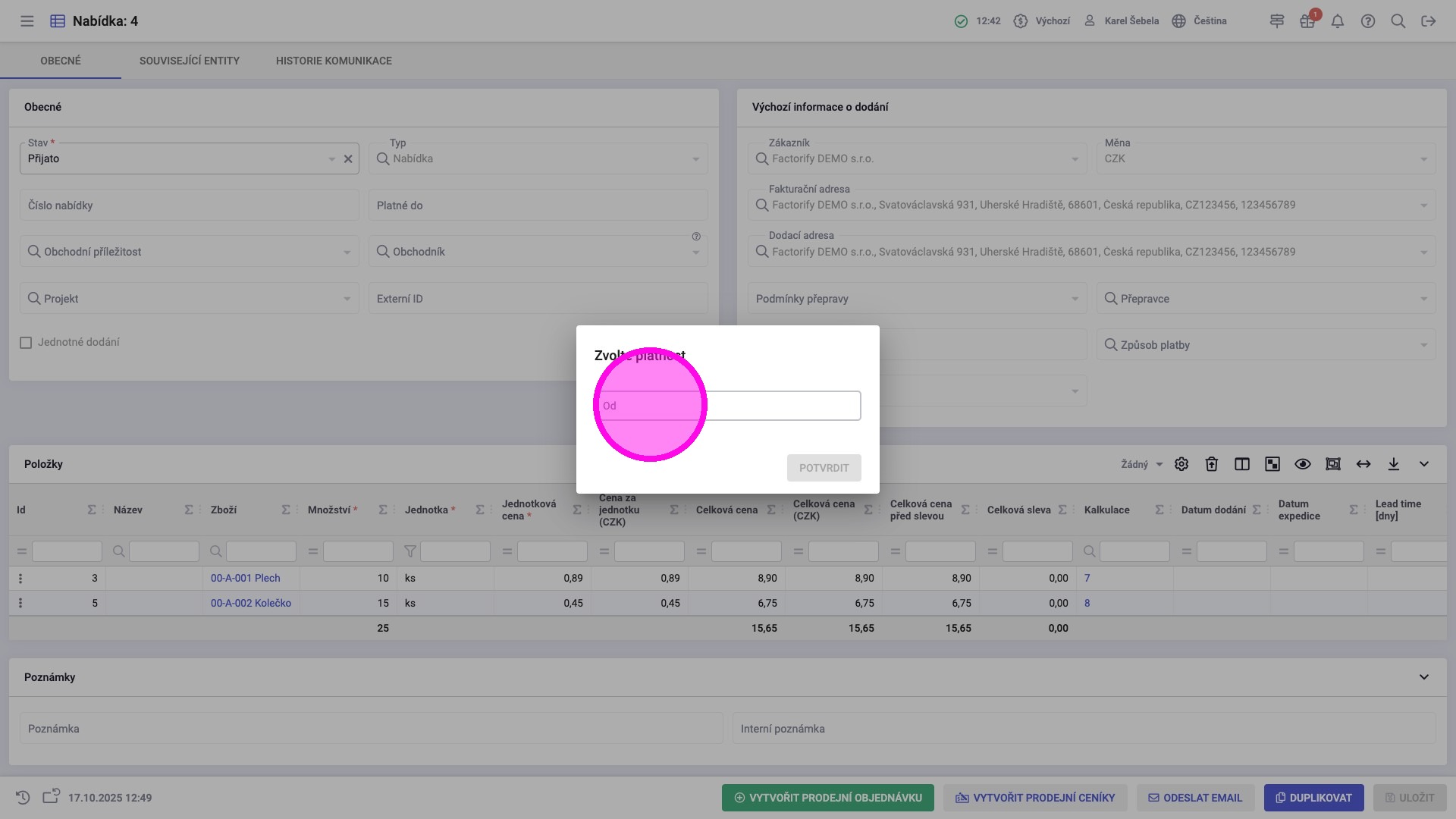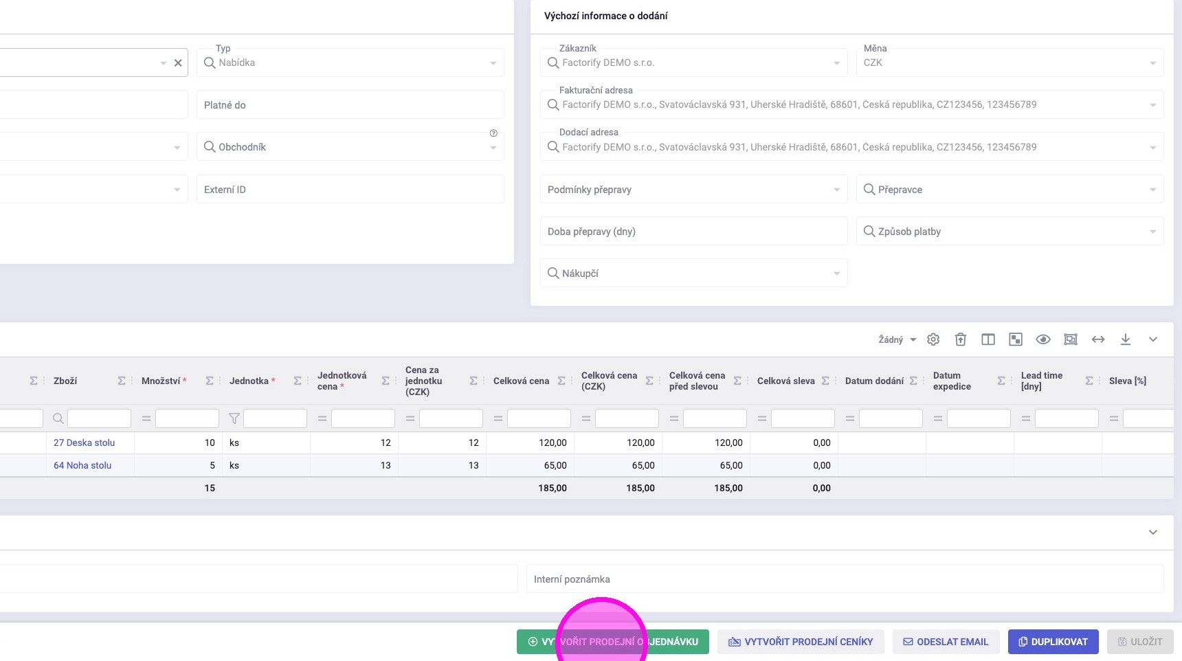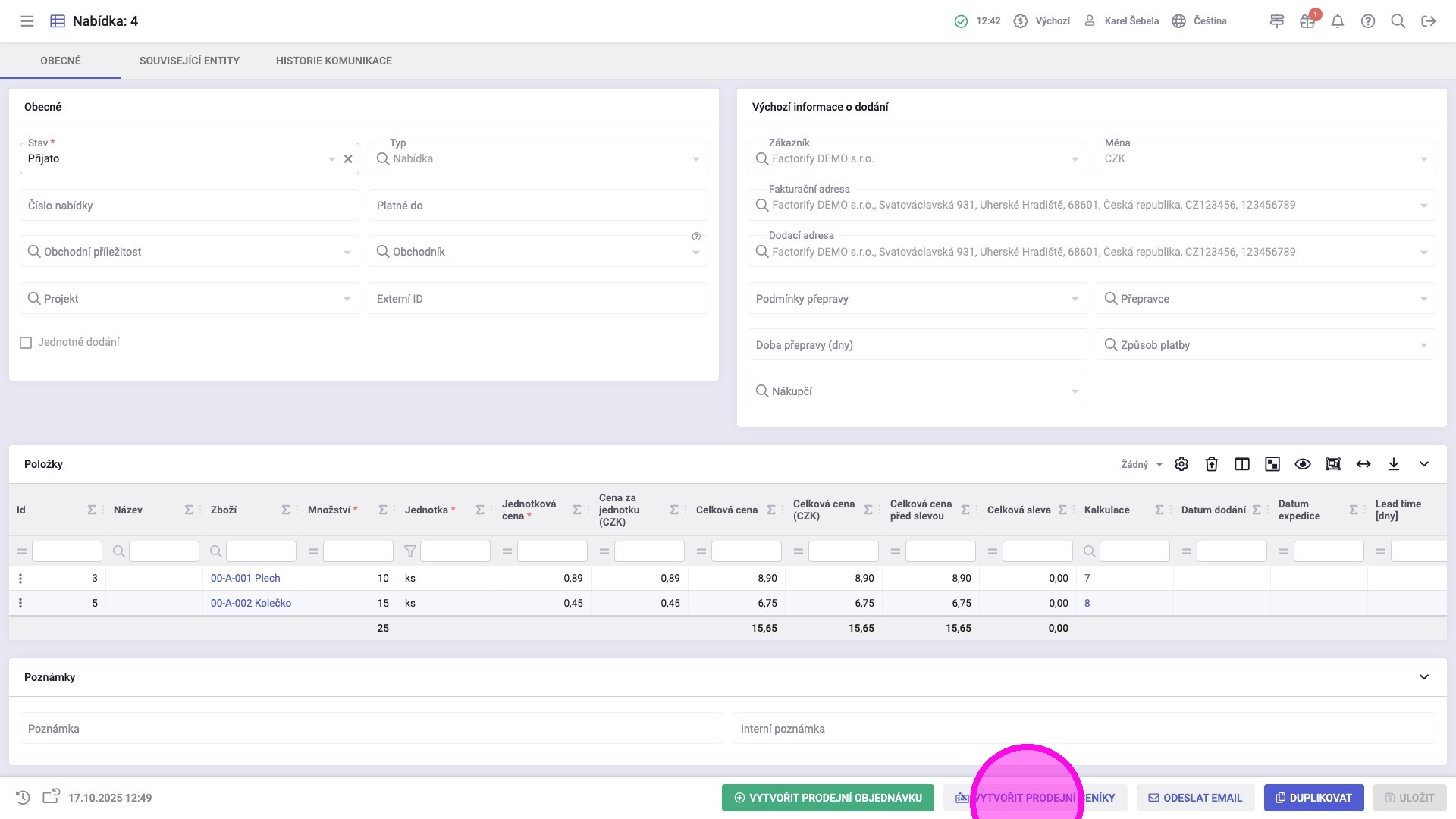 5. Údaje z nabídky se přenesou do prodejní objednávky.