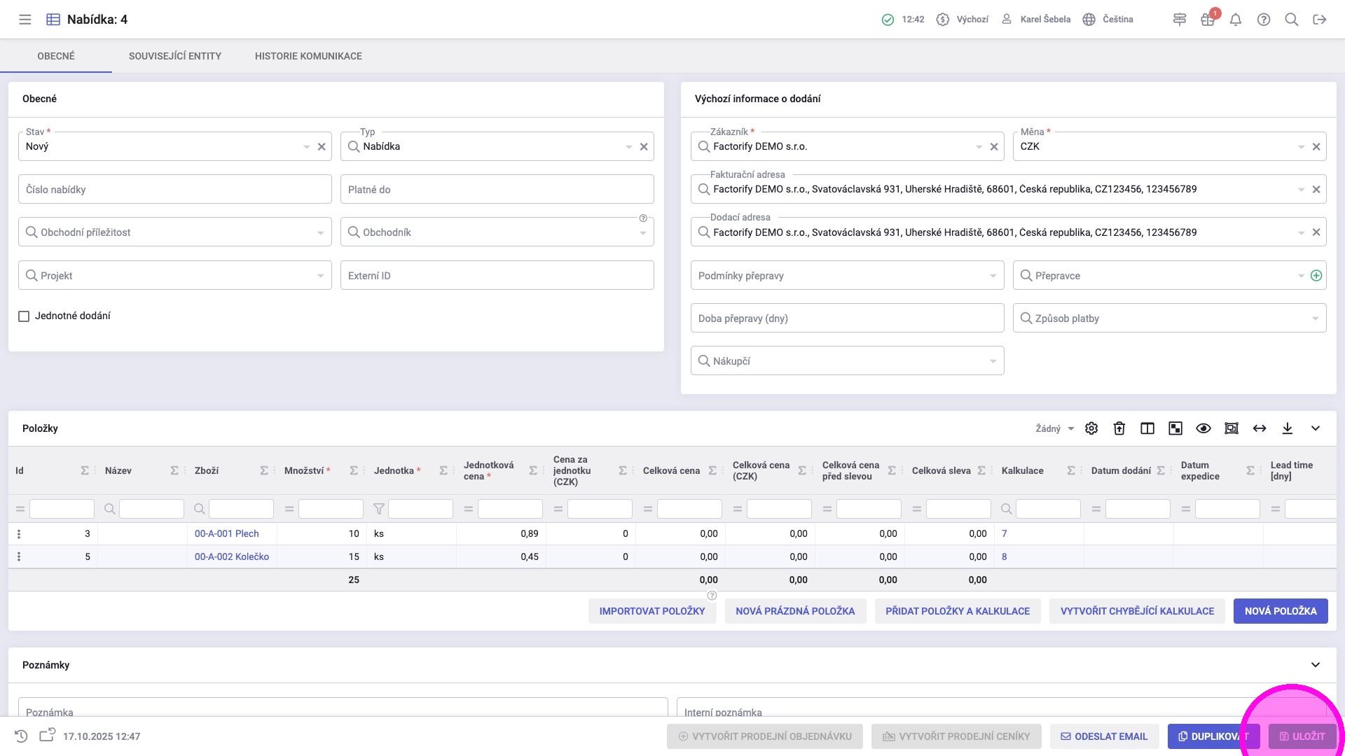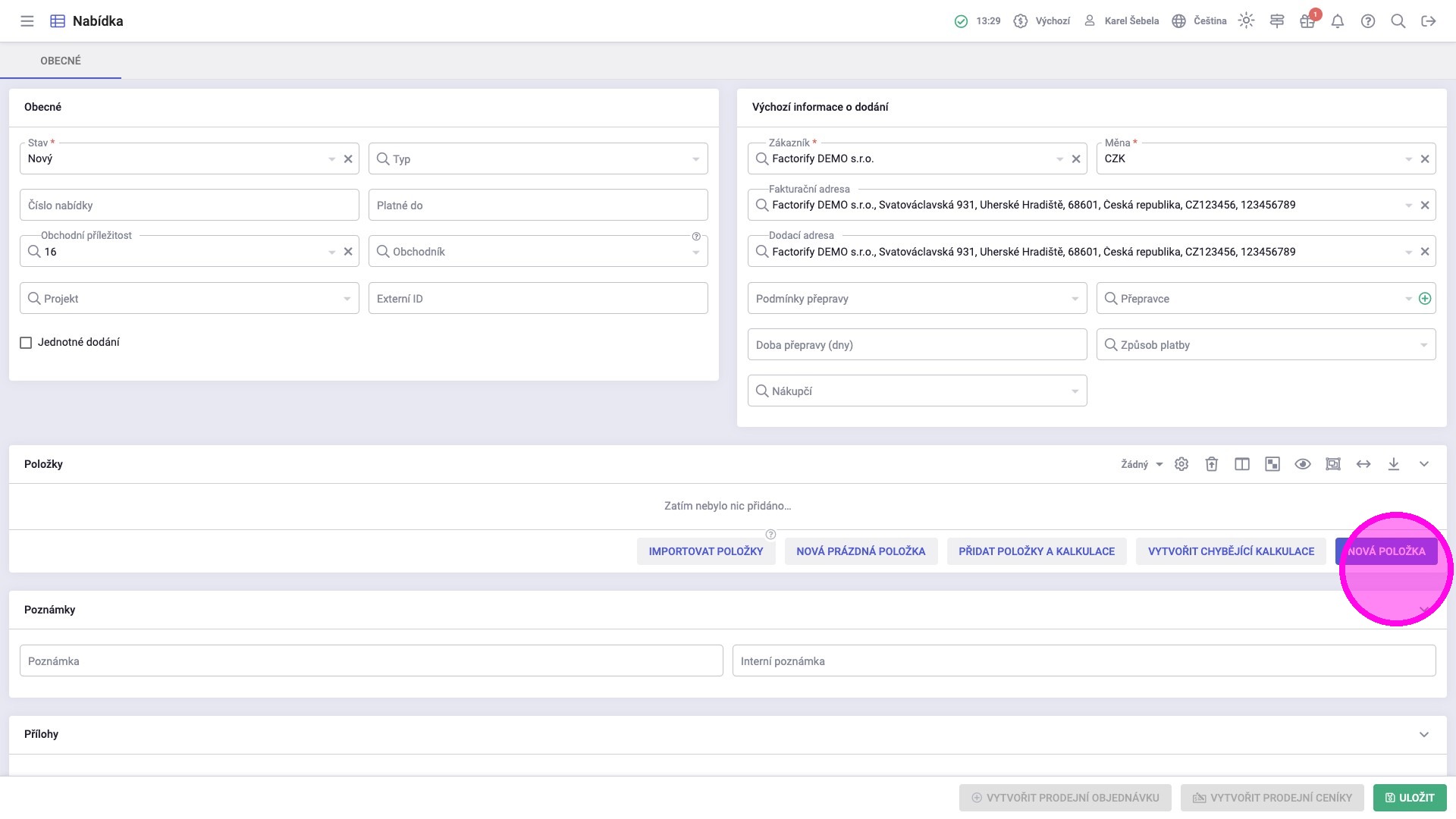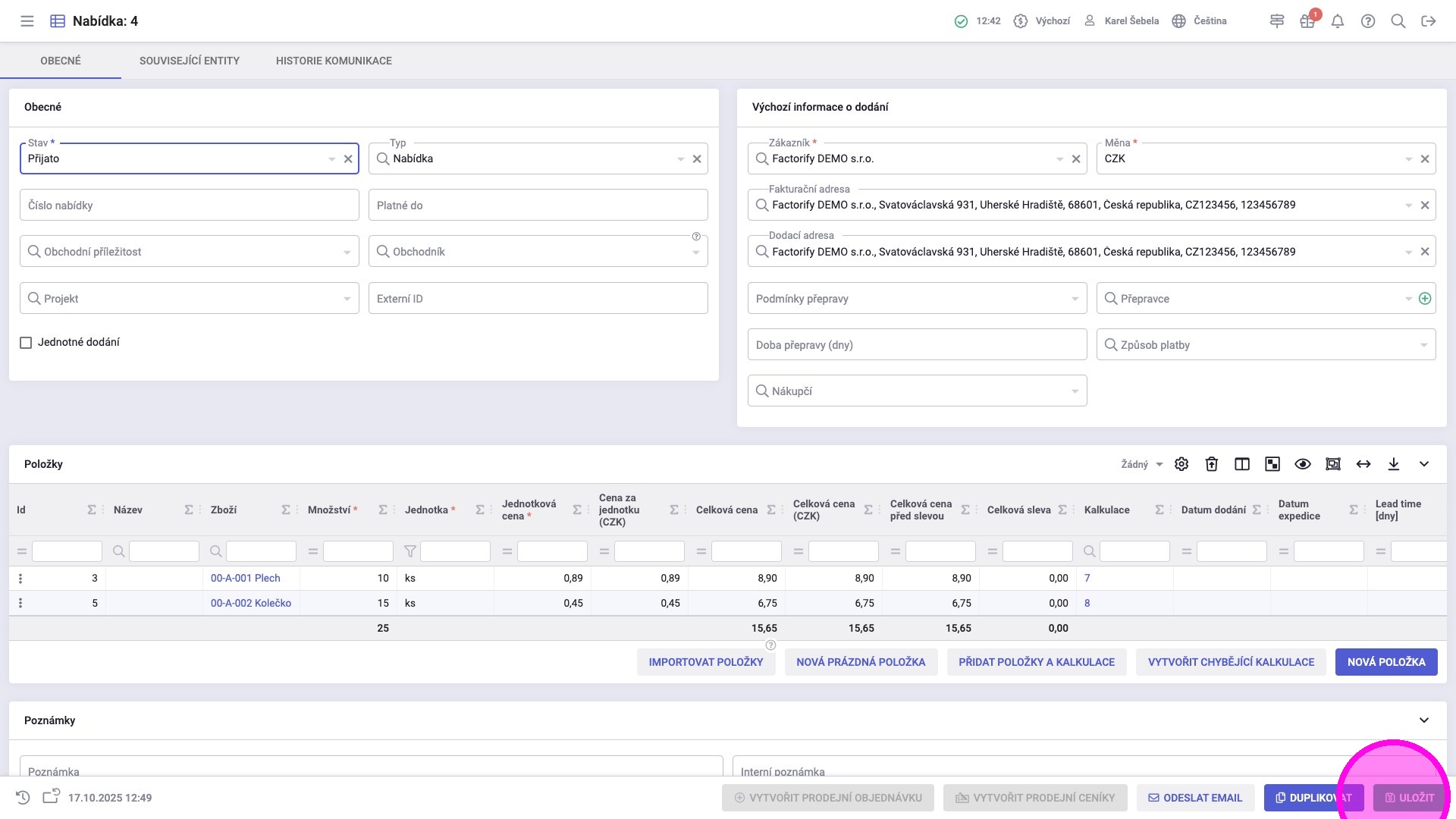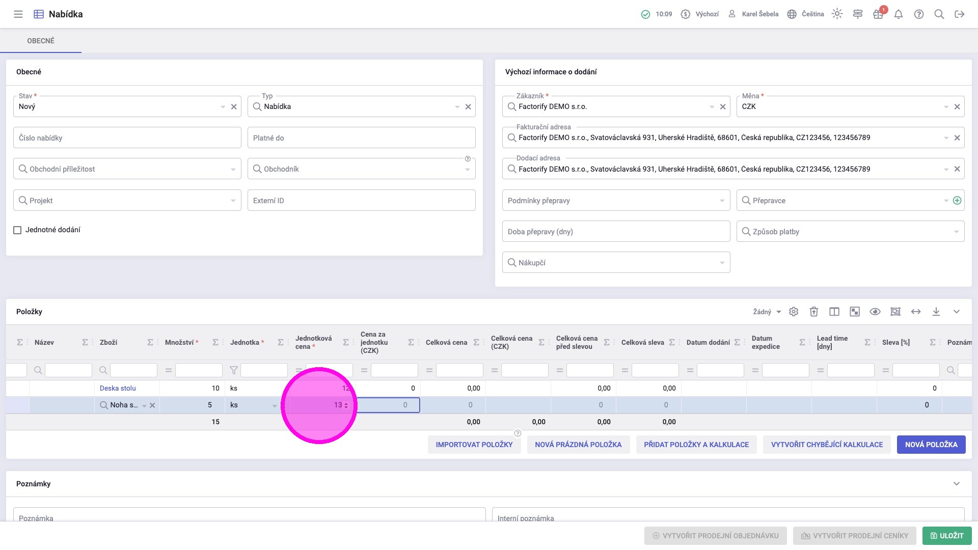5. Údaje z nabídky se přenesou do prodejní objednávky.