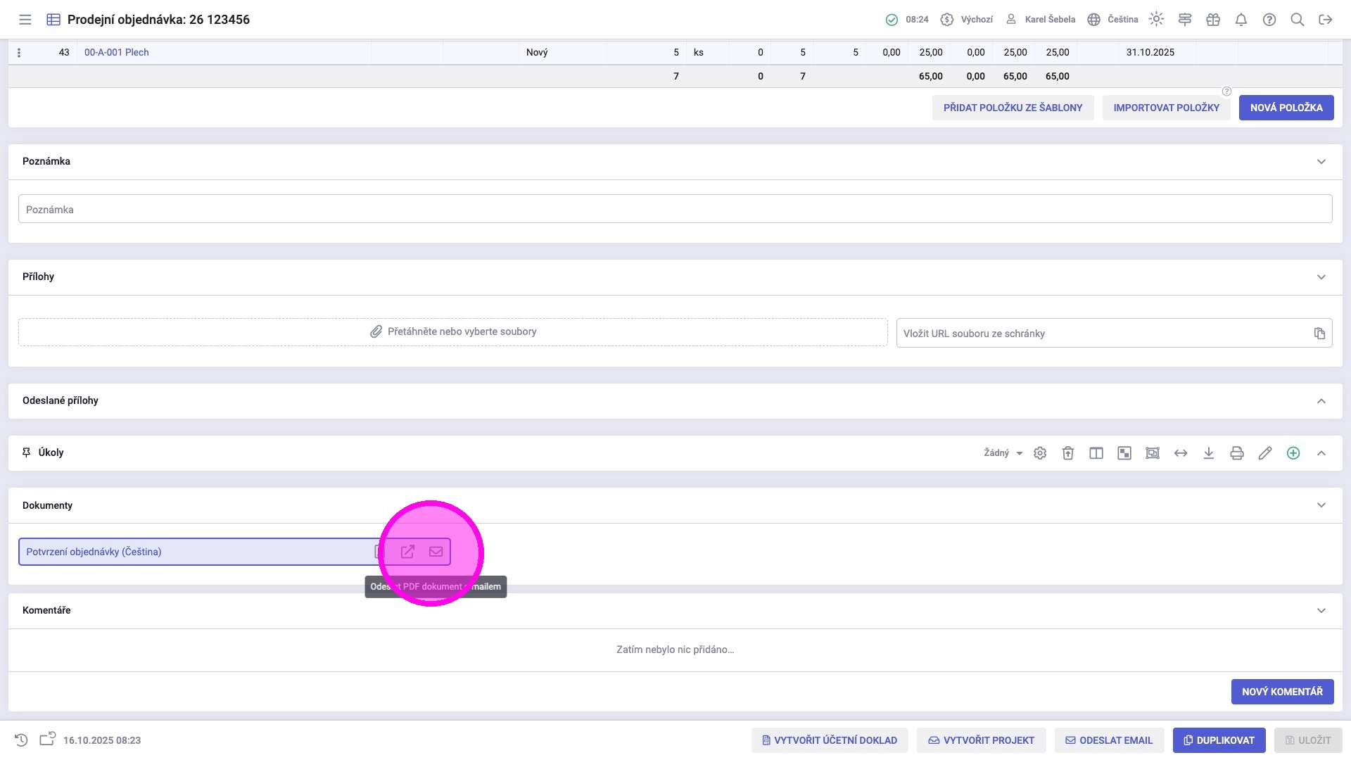 11. Kliknout na ikonku poštovní obálky pro poslání potvrzení objednávky.