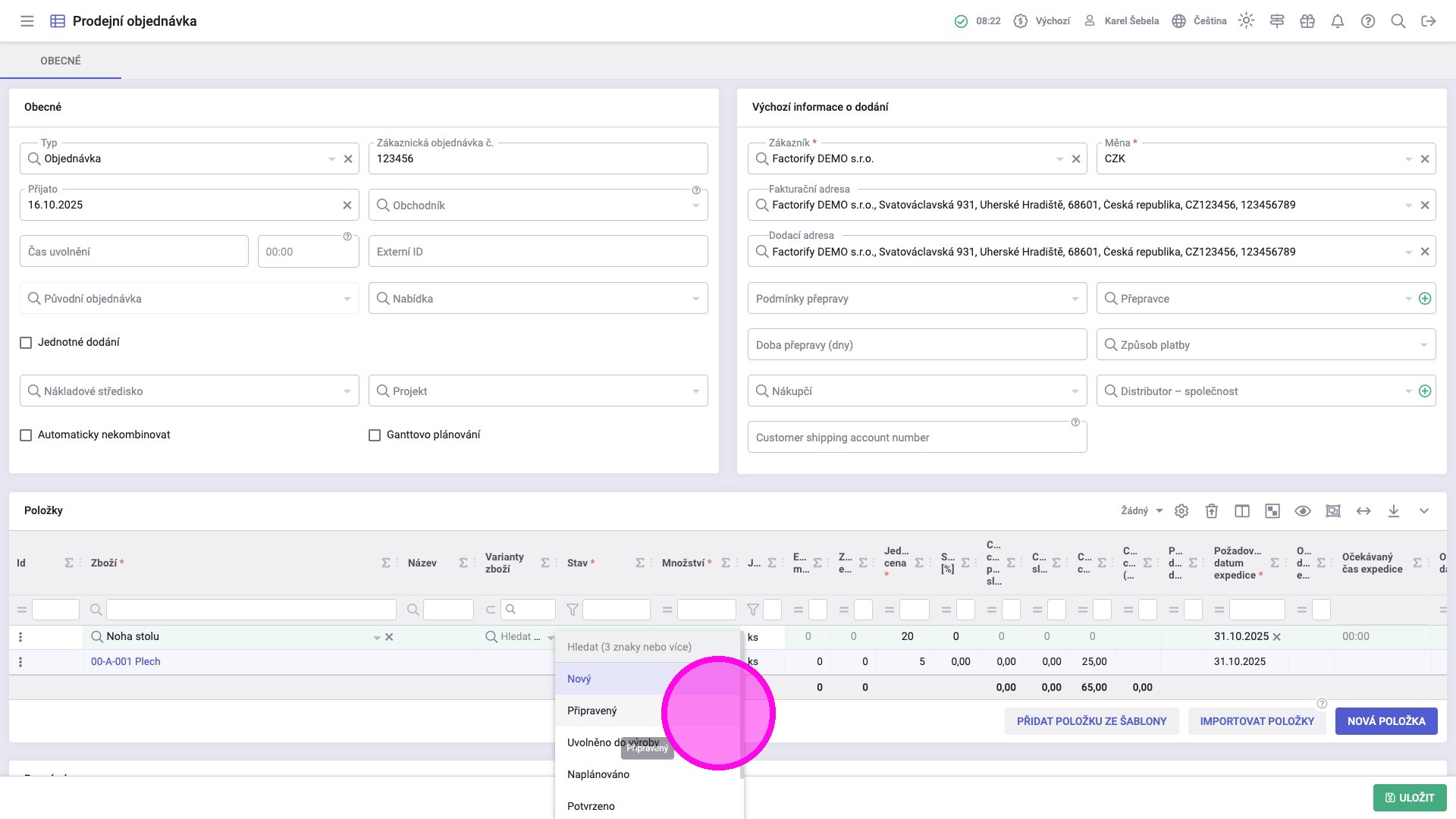 8. Přepnout na stav. Kliknout na „Připravený“, pokud jste s objednávkou spokojeni a předáváte ji dalším oddělením ke zpracování.