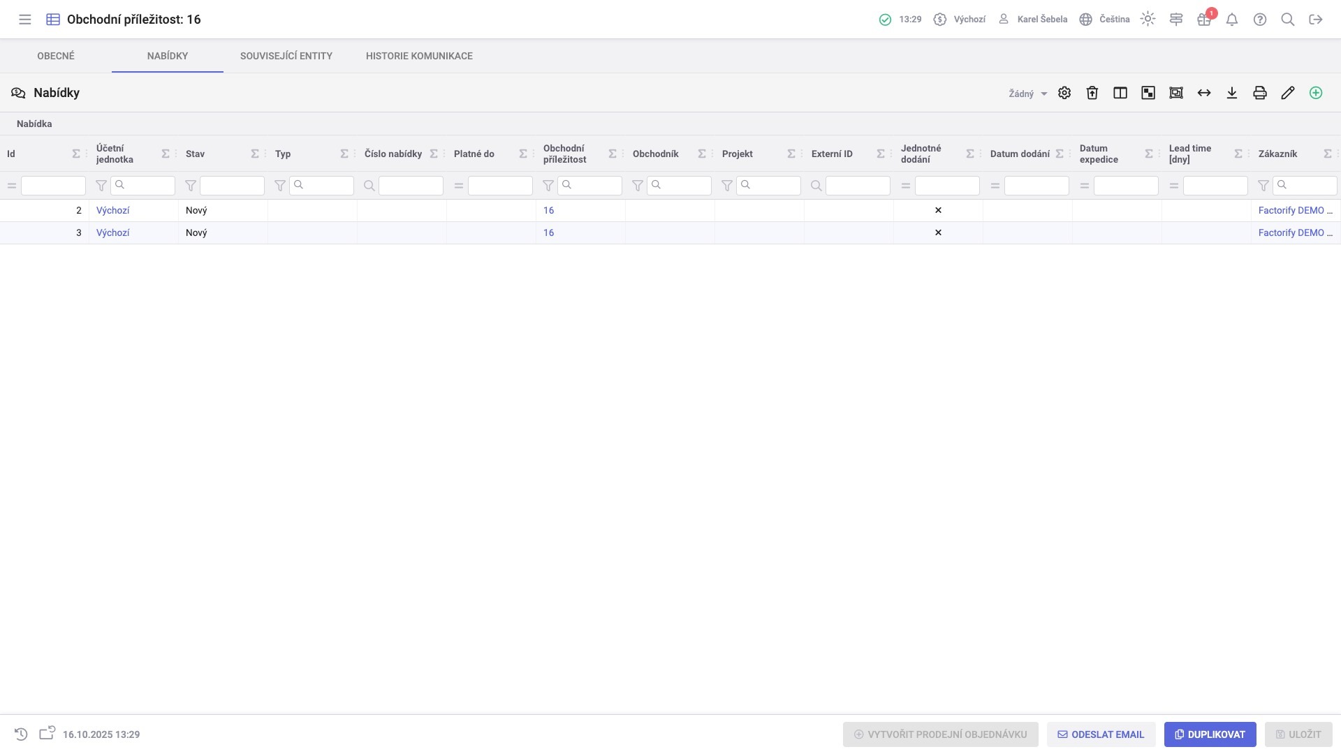 5. V záložce Nabídky zakládáte nabídky pro danou obchodní příležitost.