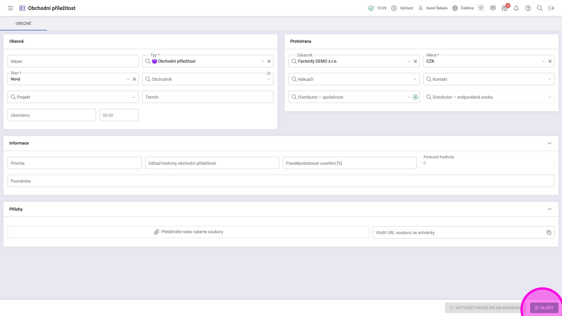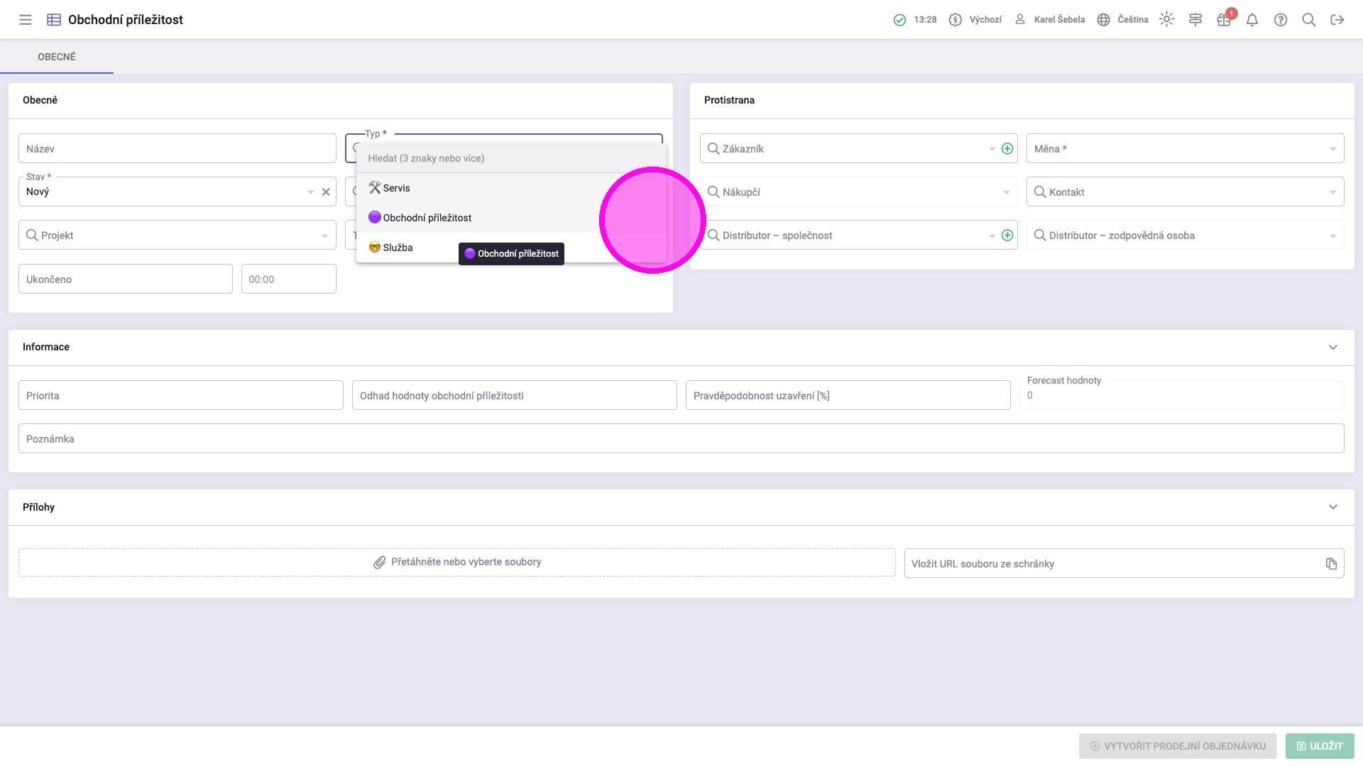 Nebo použít zkratku Ctrl+mezera a napsat zkratku „op n“. (opportunity new)