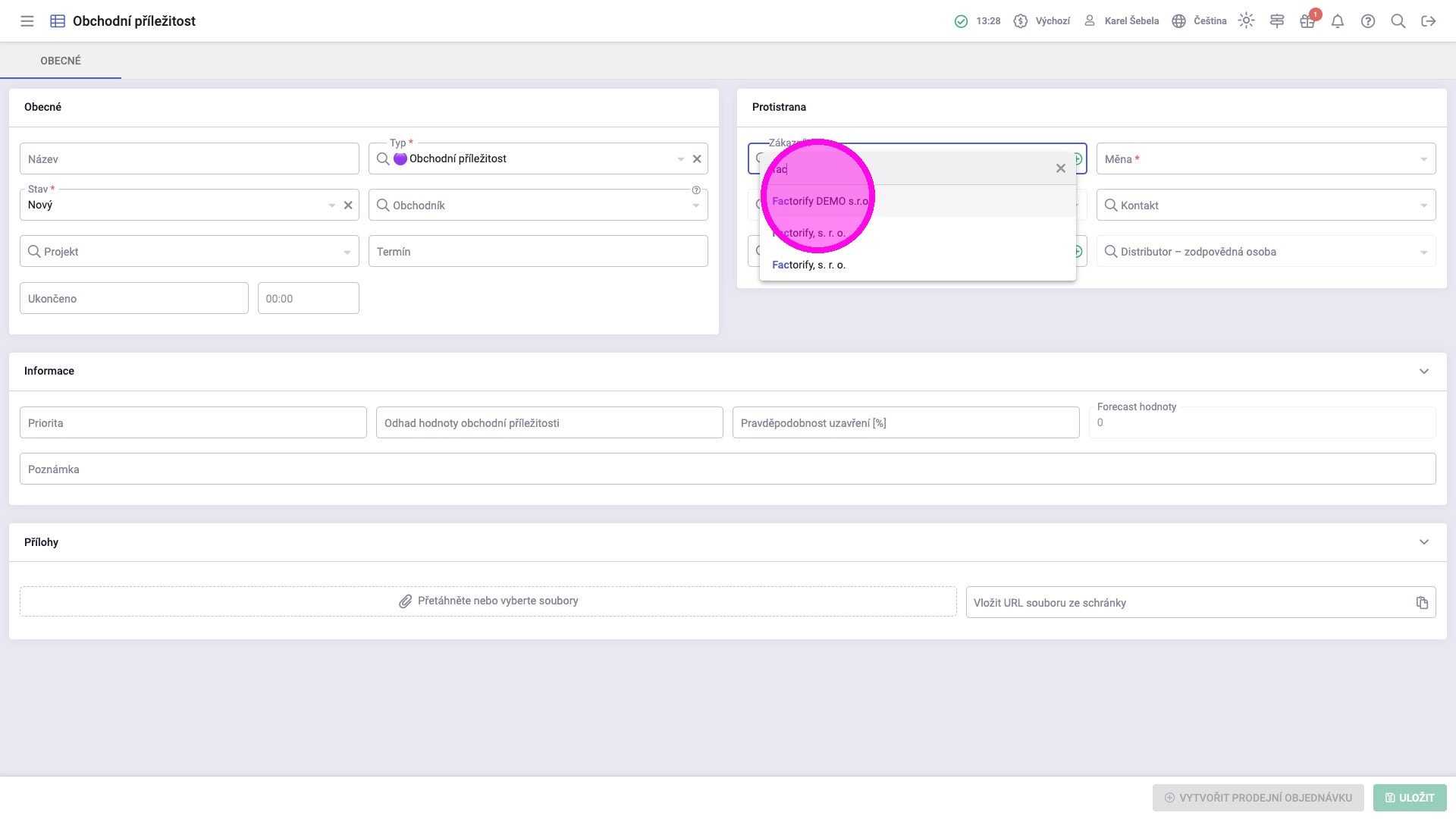 3. Kliknout na pole „Zákazník“ a vybrat zákazníka.
