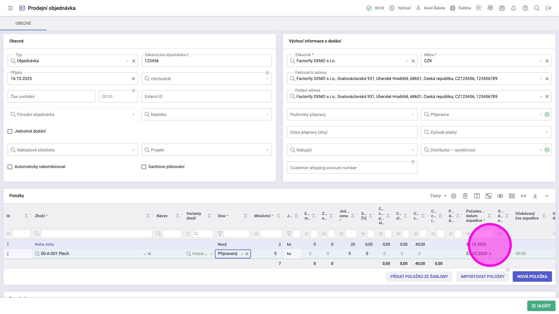 Pro účel plánování systém bere jako primární datum "Požadovaný datum expedice". Pokud ale je potřeba výrobu dokončit v jiný termín a nechcete měnit slíbený termín zákazníkovi, vyplníte "Očekávaný datum expedice". Systém v takovém případě dá přednost pro plánování tomuto datu.