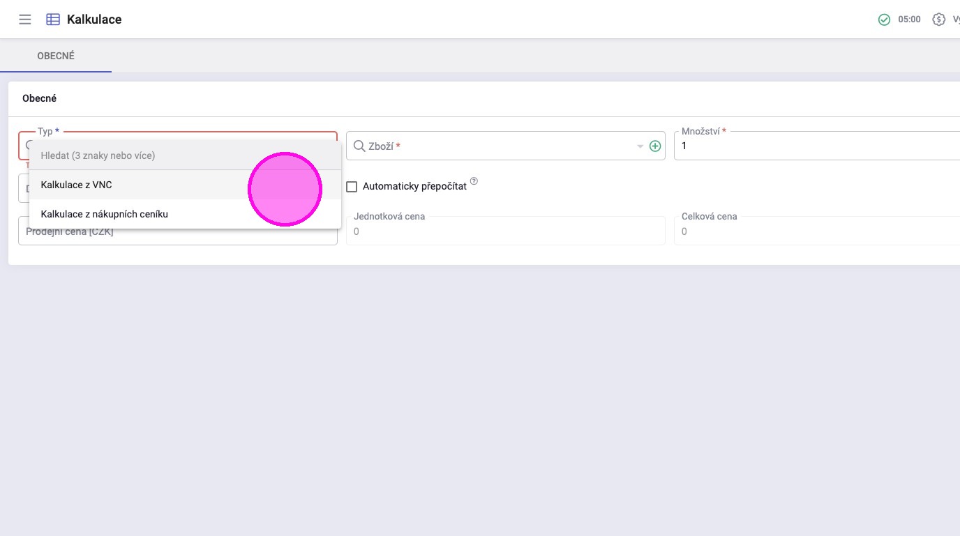 3. Vybrat „Zboží“ pro které kalkulaci děláte.