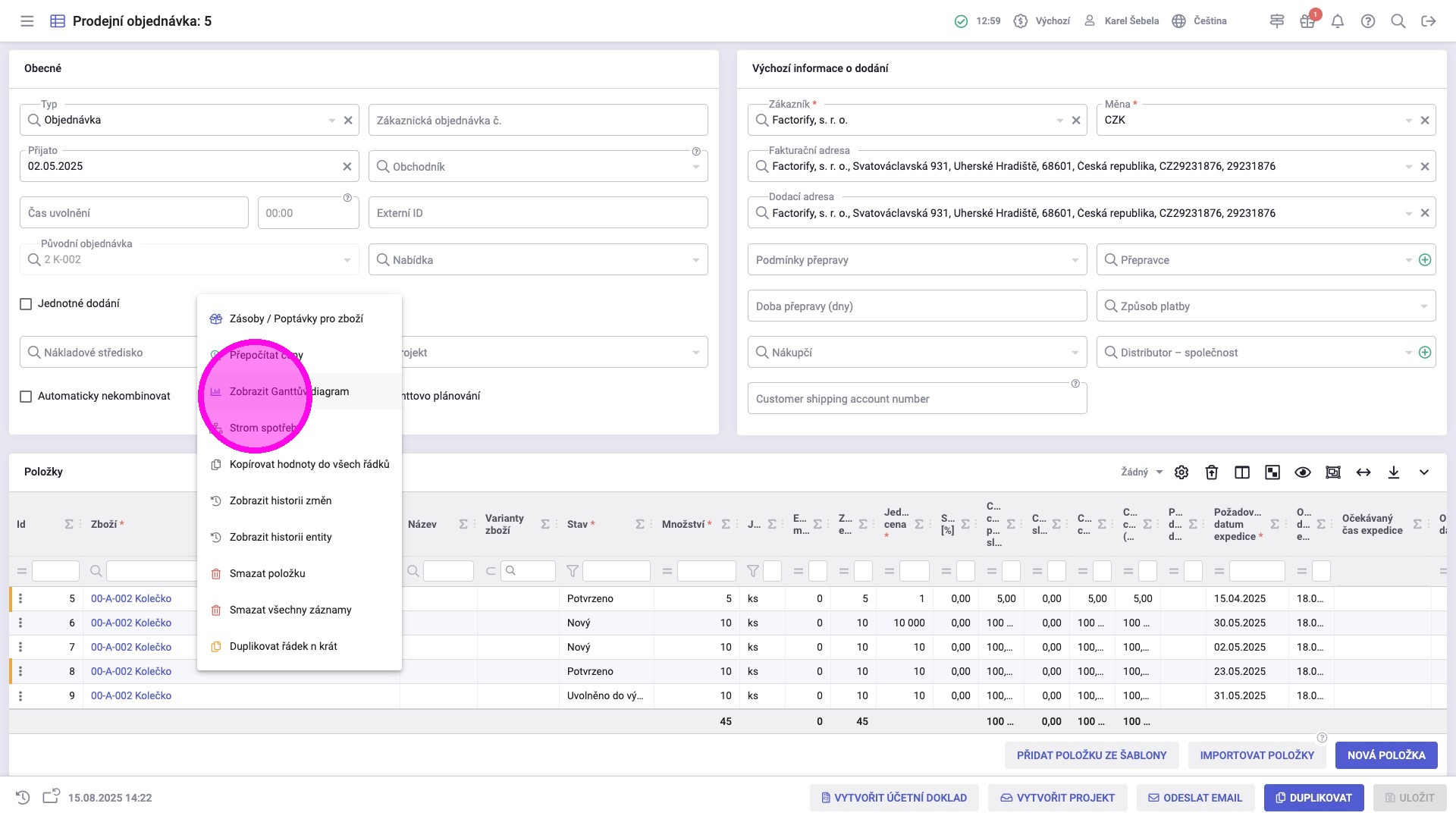 Pro rychlé zjištění, v jakém stavu je položka prodejní objednávky, se můžeme podívat na kritickou cestu k položce, která je nejposlednější, nebo na Ganttův diagram sestav či konkrétní výrobní dávky.
