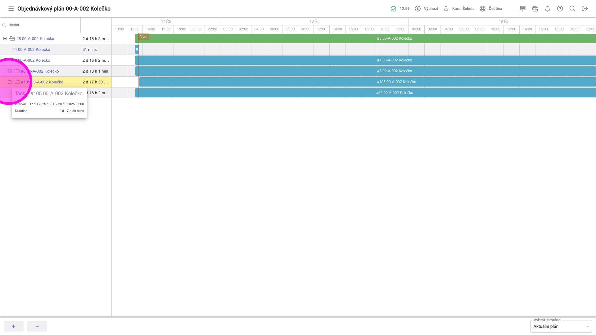 Agenda „Naplánované objednávky“ slouží pro rychlý tabulkový přehled, v jakých termínech budou objednávky dokončeny podle spočítaného plánu výroby. Obdobný přehled nabízí agenda „Plánování objednávek“, kde jsou údaje zobrazeny graficky. V obou agendách je možné simulovat různé obchodní scénáře.