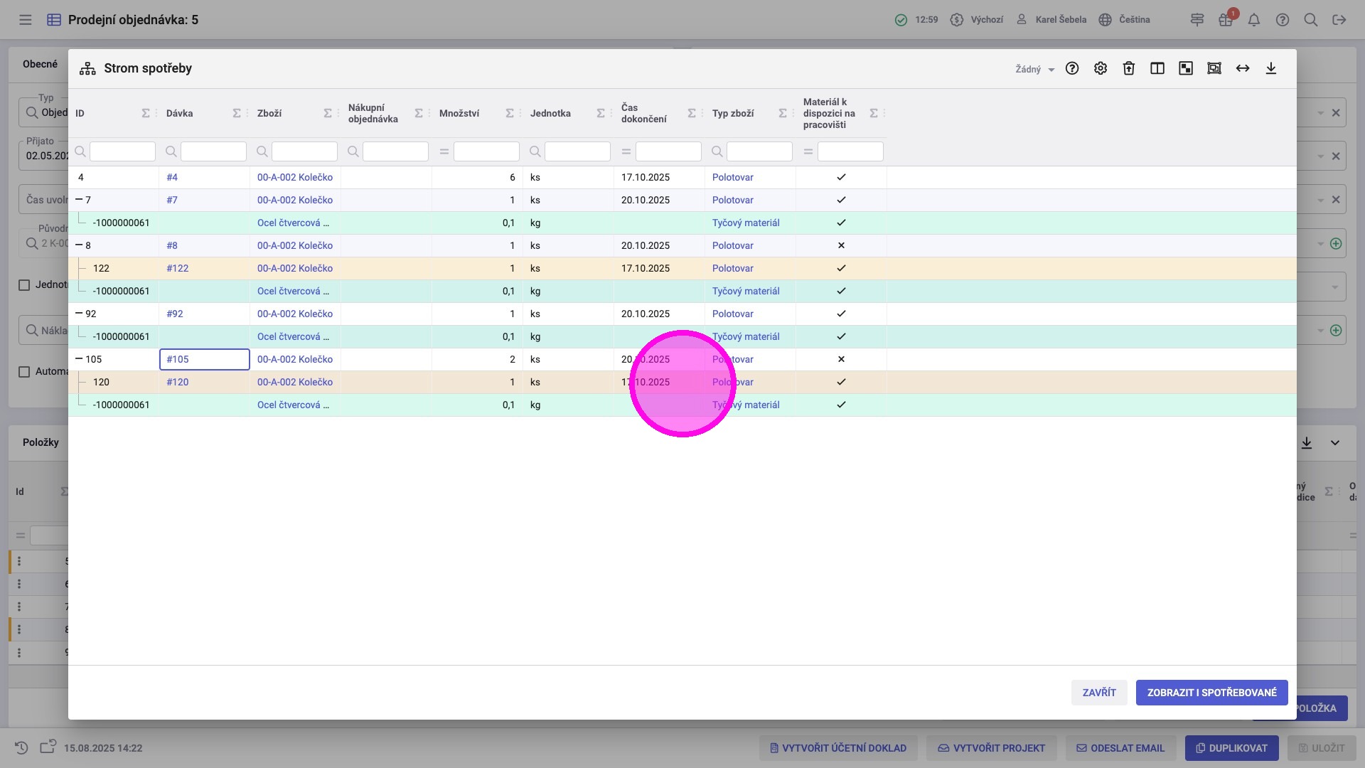 Naplánováno - Vedoucí výroby si objednávku přepne do stavu naplánováno a vyhodnotí, jak se objednávka zaplánovala. Od tohoto stavu se objeví všechny kusovníky a materiál potřebný k výrobě daného výrobku ve výhledu nákupu, pokud ho je nedostatek.
