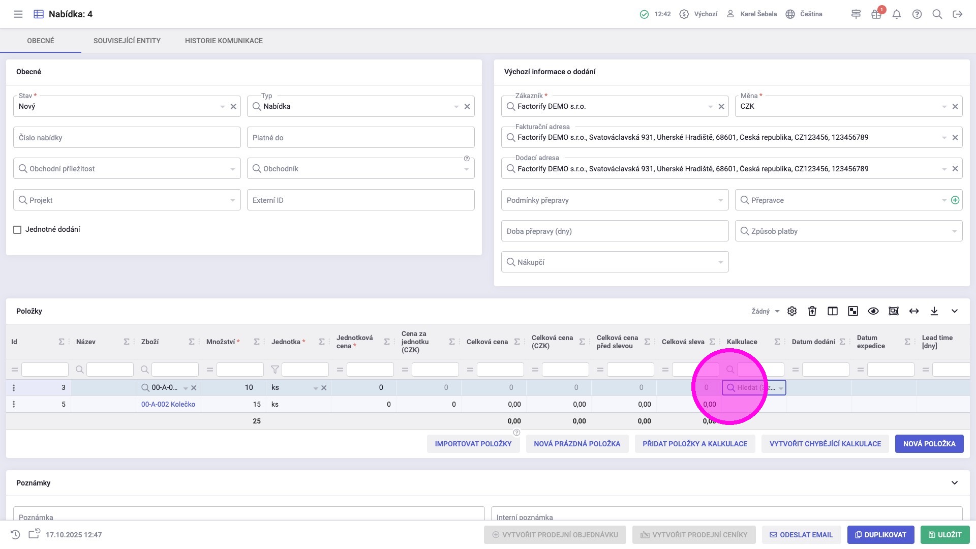 Na položkách nabídky, kde je vybraná kalkulace, se doplní cena z kalkulace. Tam, kde kalkulace není, se vezme platná cena z prodejního ceníku zboží.