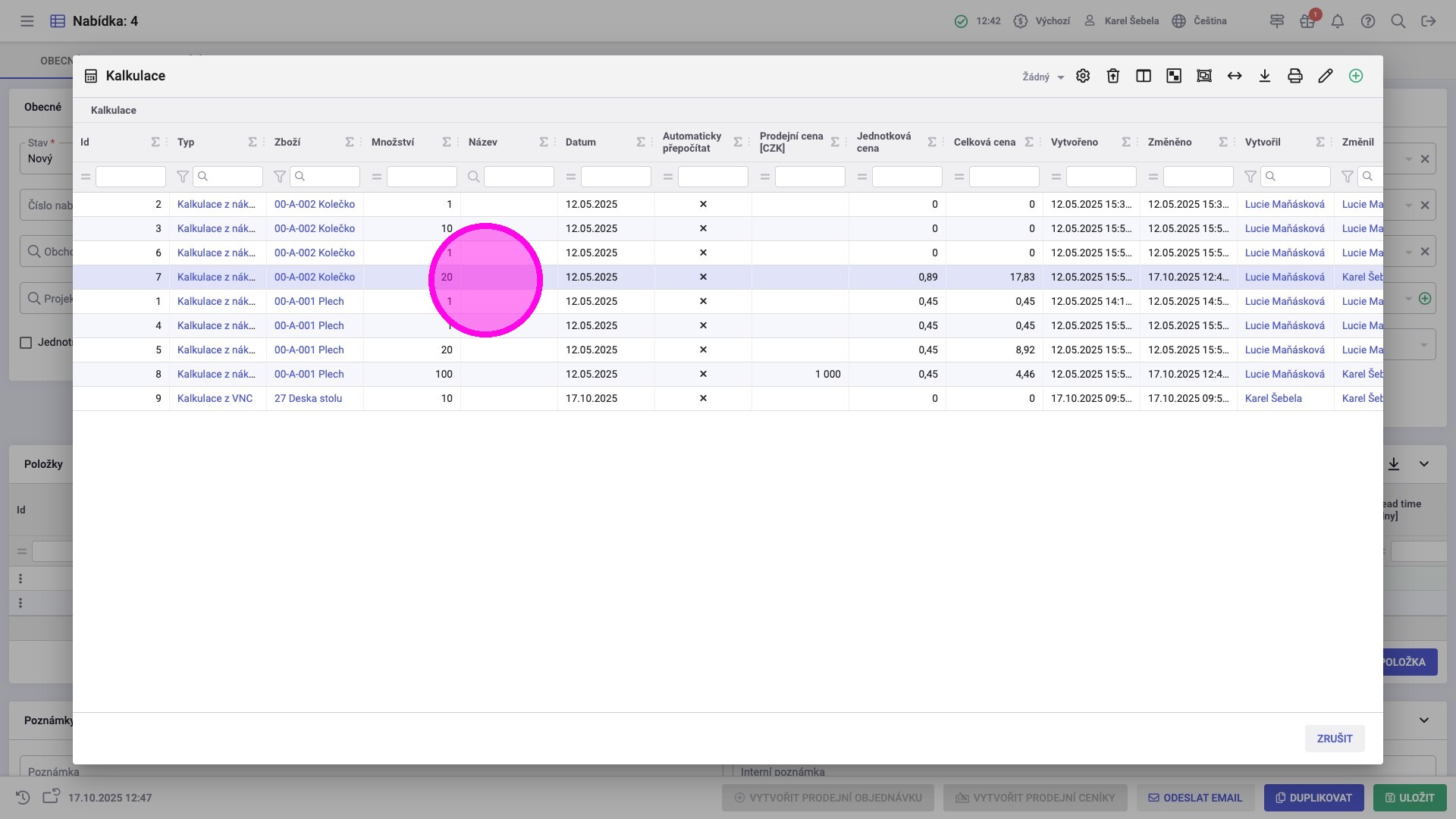 1. V nabídce vybrat patřičnou kalkulaci k odpovídajícímu zboží pomocí ikonky lupy.