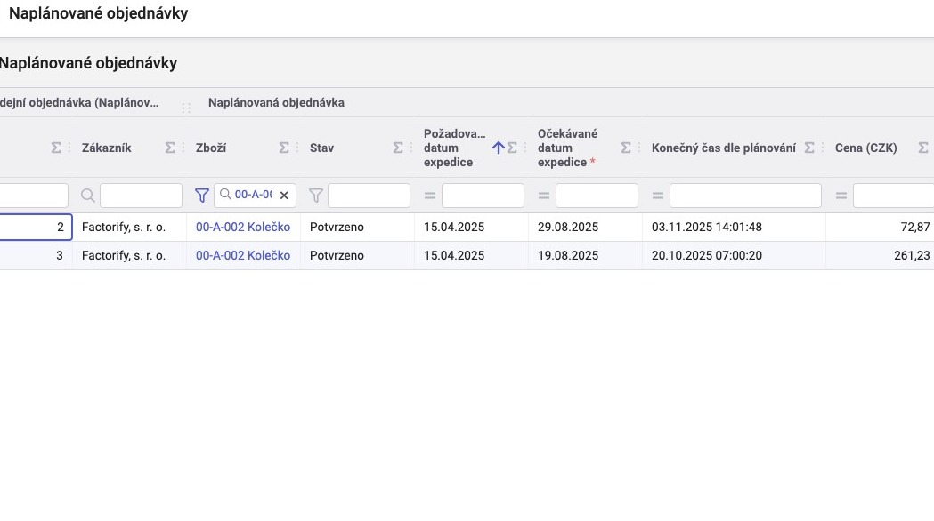 Tip: Je vhodné si přidat sloupce Konečný čas dle plánování, cena, počet k expedici, expedované množství a zpožděné dny.