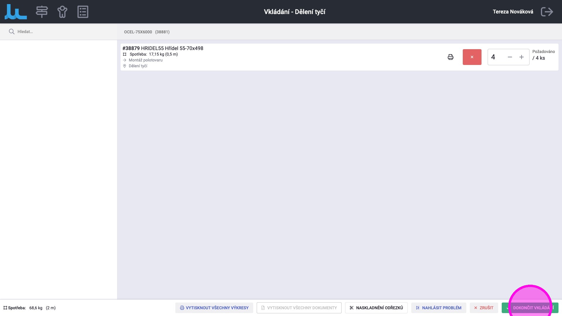 4. Nastavit množství, které se má dokončit. Automaticky je nastaveno zbývající množství. Změnit lze kliknutím do pole a napsáním hodnoty nebo pomocí tlačítek plus a mínus.