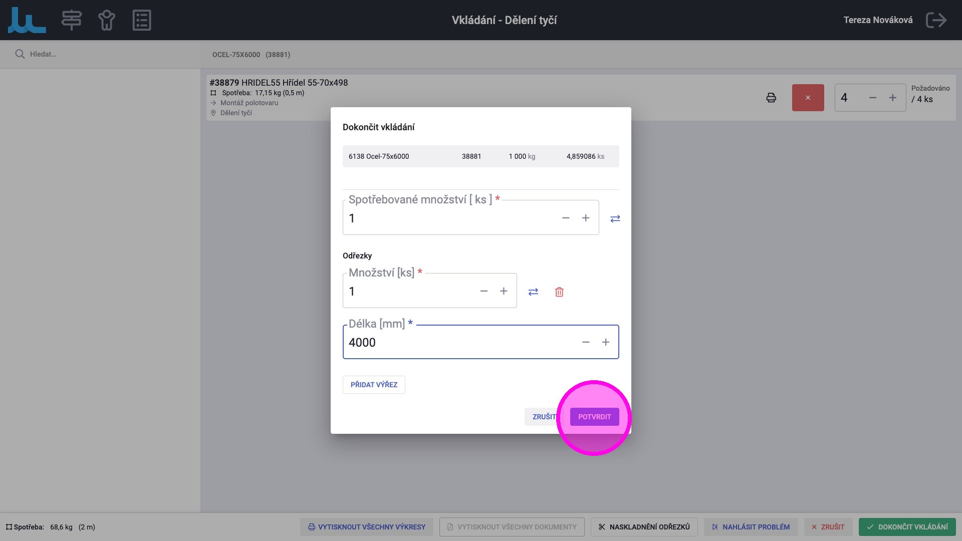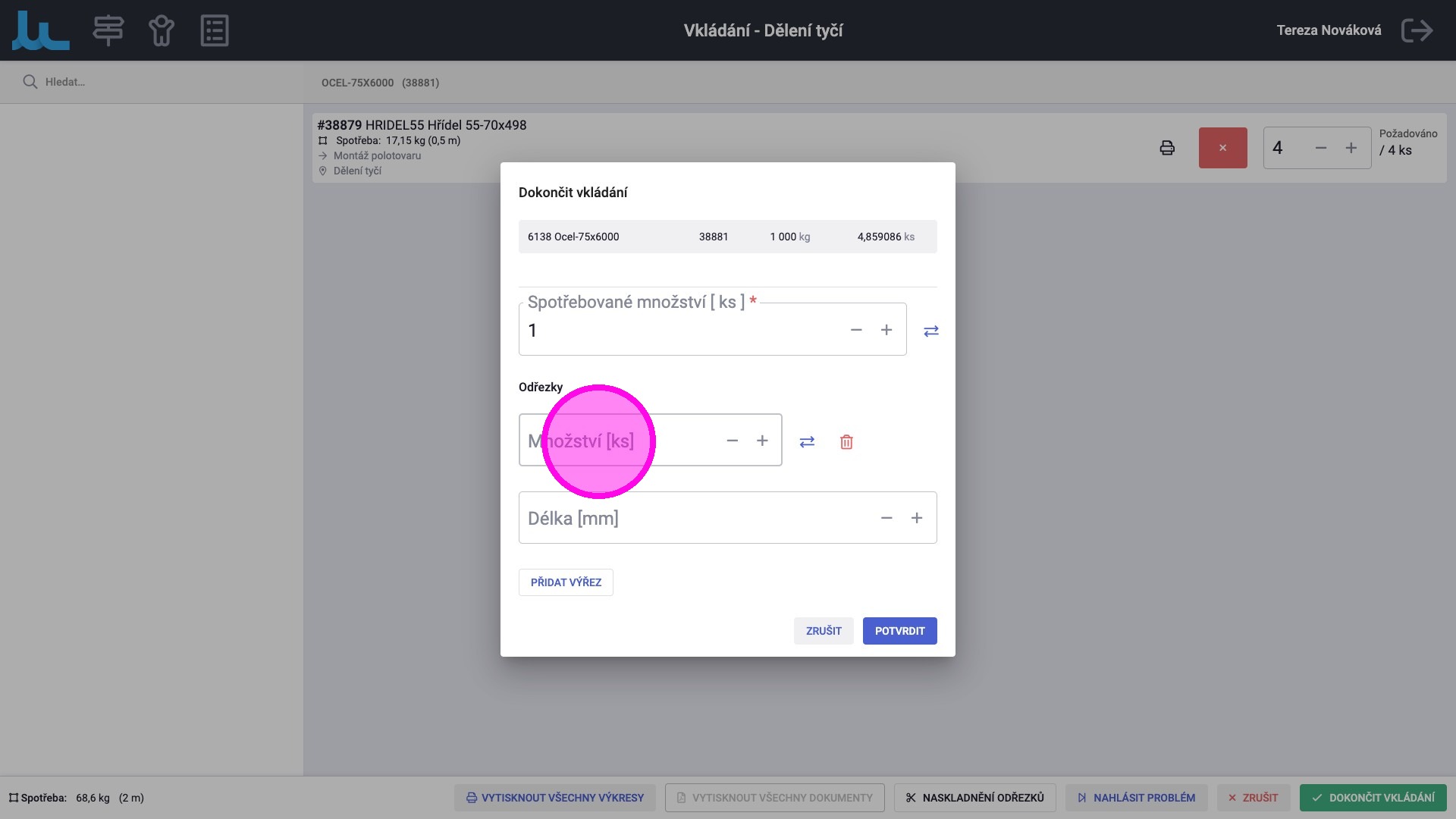 Zadat "Spotřebované množství", eventuelně použitelné odřezky.