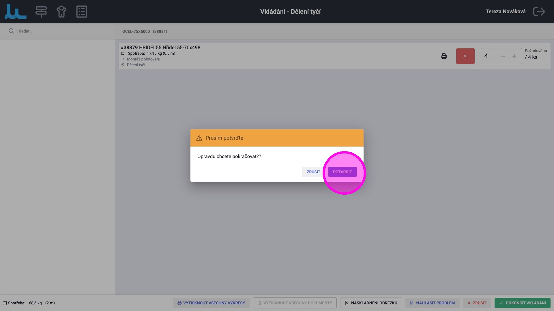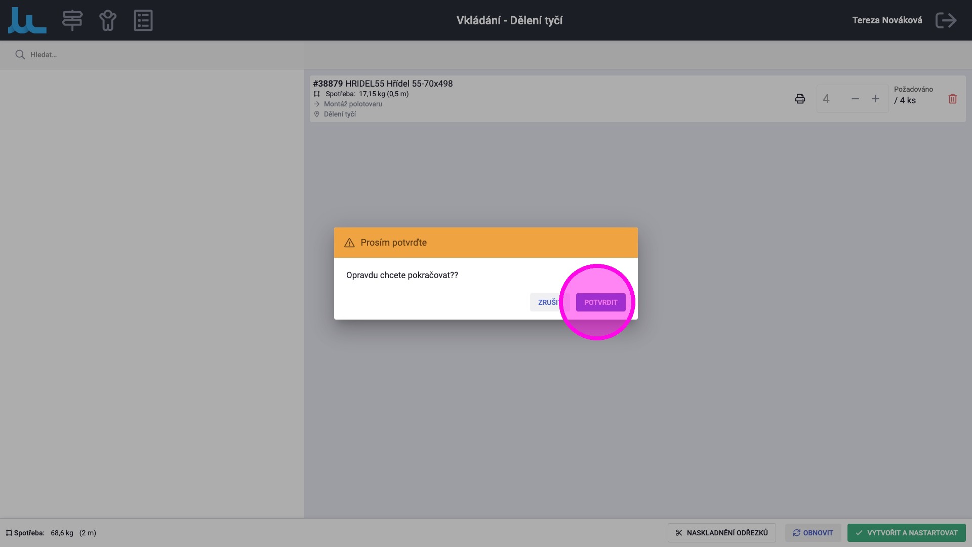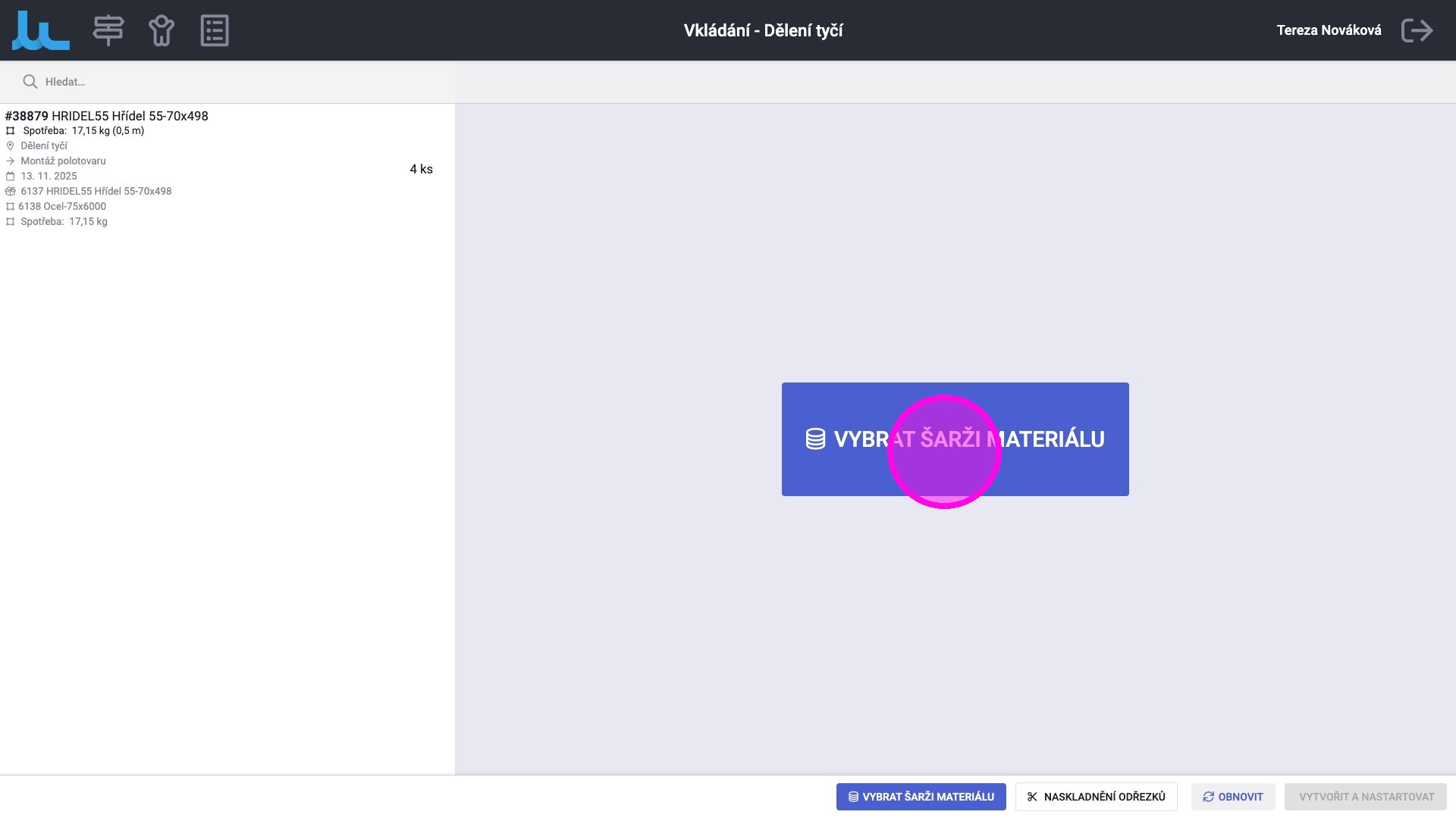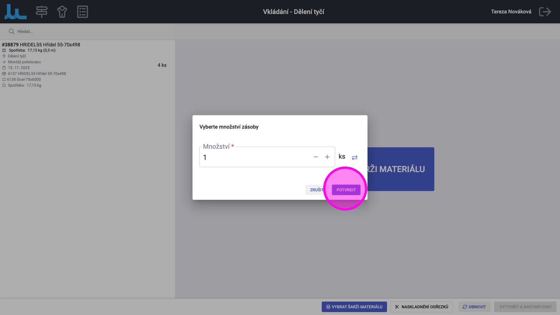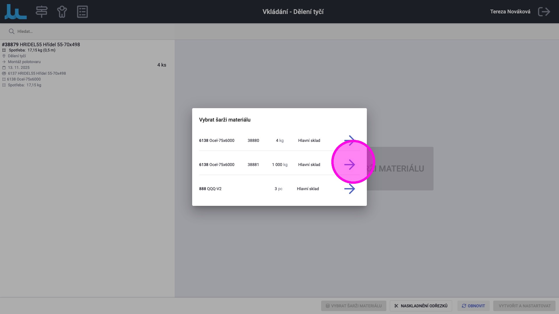 3. Zvolit dávku materiálu kliknutím na šipku nebo jejím naskenováním.
