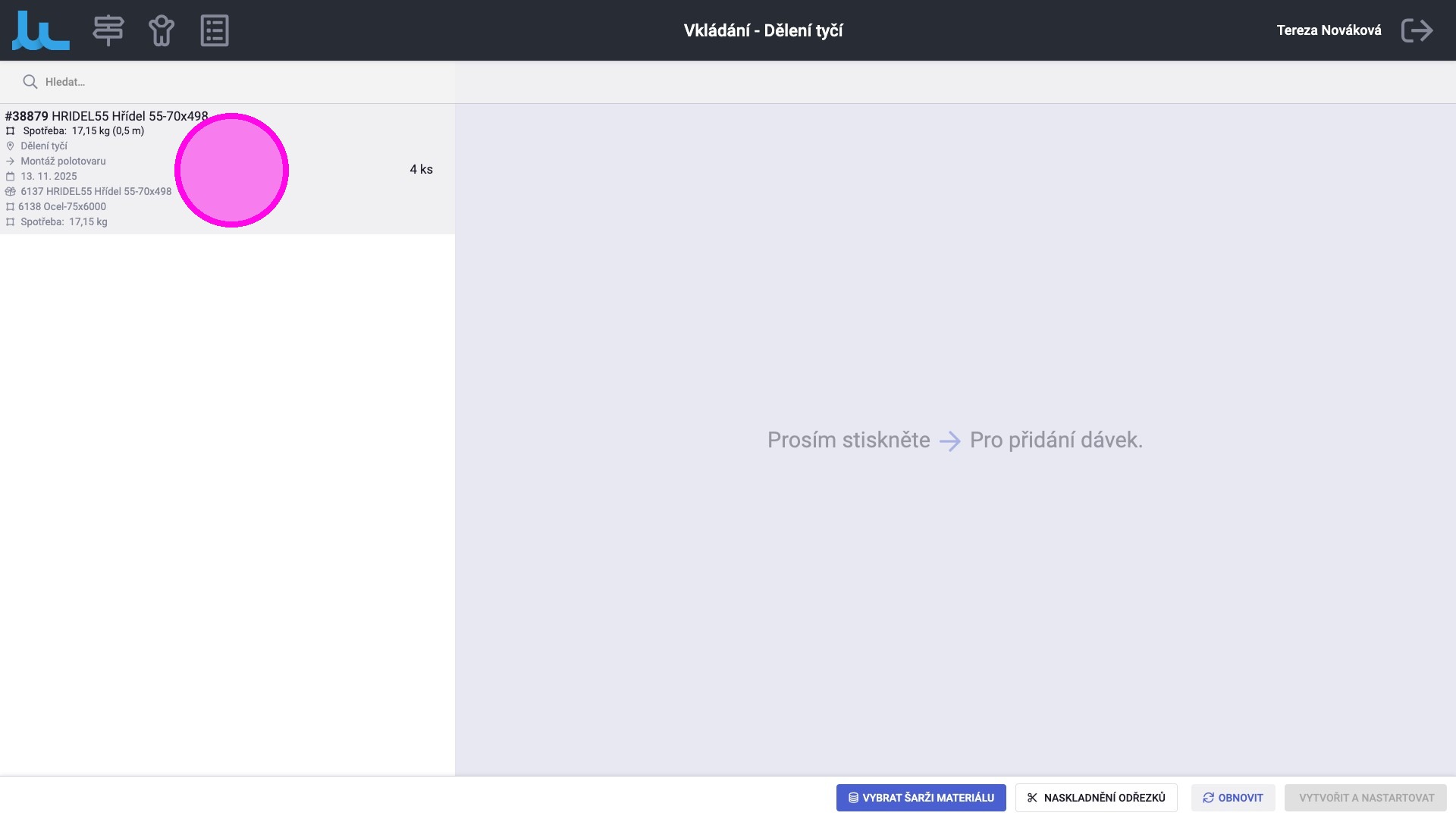 3. Zvolit materiálovou dávku kliknutím na šipku nebo jejím naskenováním.