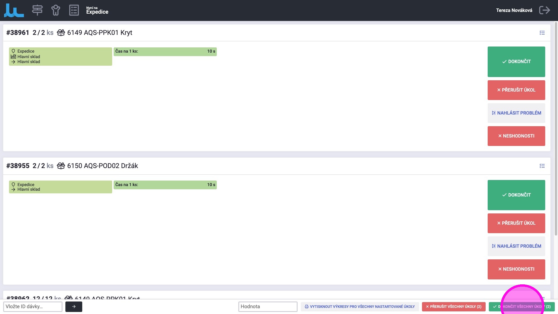 V závorce je počet dokončovaných úkolů. Tlačítko se zobrazí, pokud jsou nastartované alespoň 2 úkoly na tomto pracovišti.