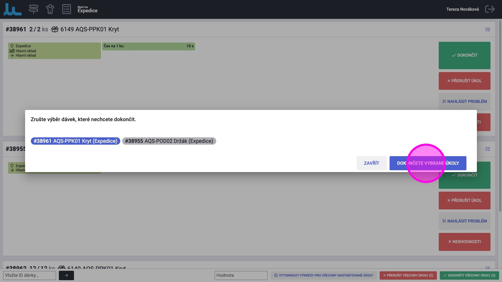 1. Na výrobní obrazovce u konkrétní dávky kliknout na tlačítko "Dokončit".
