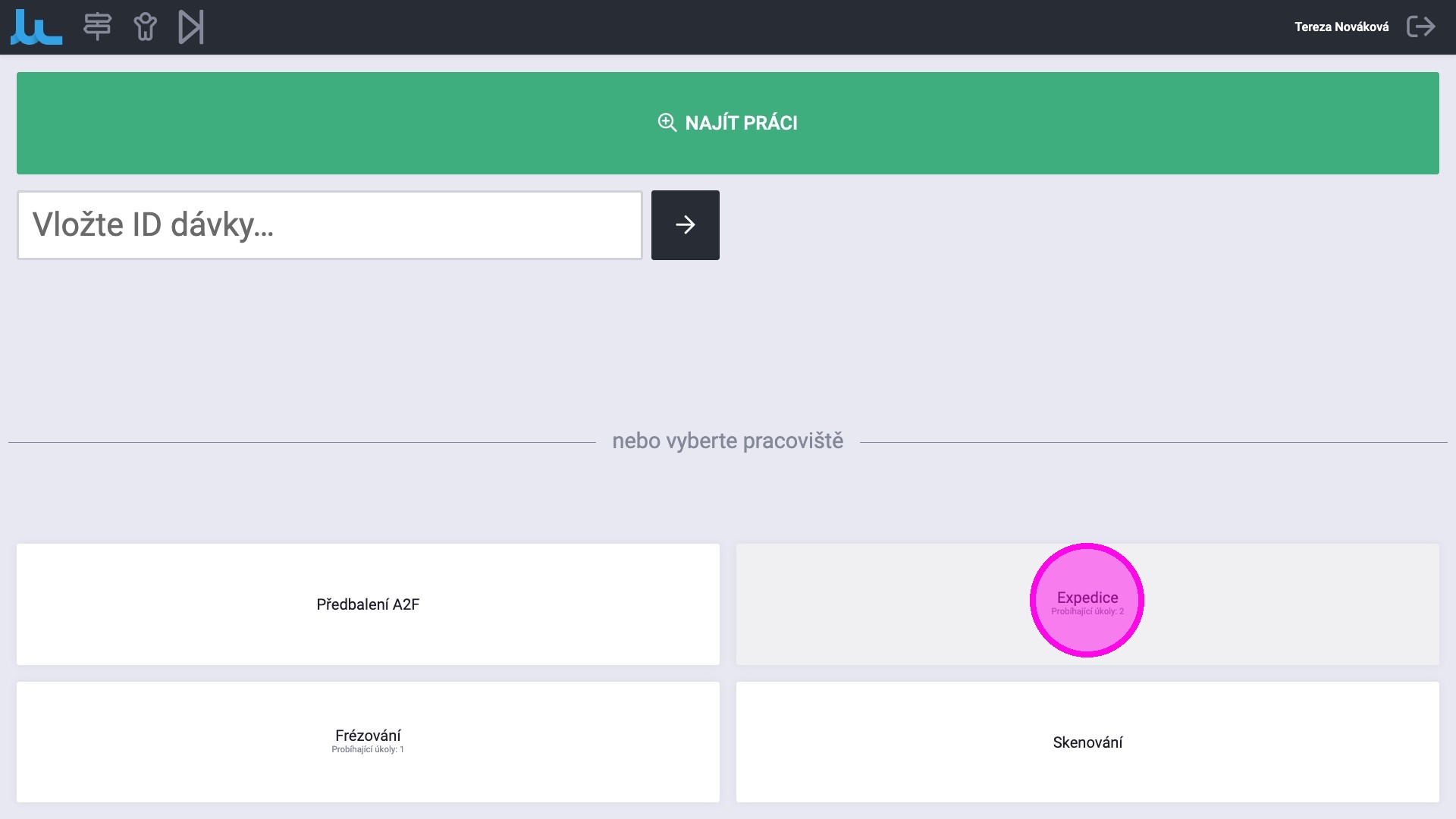 1. Na seznamu pracovišť je vidět, že na pracovišti Expedice probíhá 1 úkol a na pracovišti Frézování probíhají 2 úkoly. Kliknout na pracoviště Expedice.