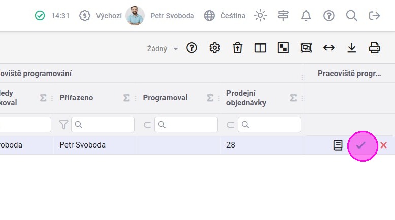 2. Jakmile je program připraven, kliknout na ikonu zelené fajfky. V případě, že ještě není program hotový, ale je potřeba přerušit práci, tak kliknout na ikonu červeného křížku. Záznam práce bude vytvořen, ale programování nebude dokončeno a bude možné v něm pokračovat.