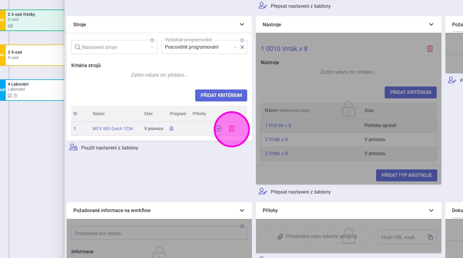 2. Vybrat operaci, kde je vybraný stroj, z kterého je potřeba program smazat.
