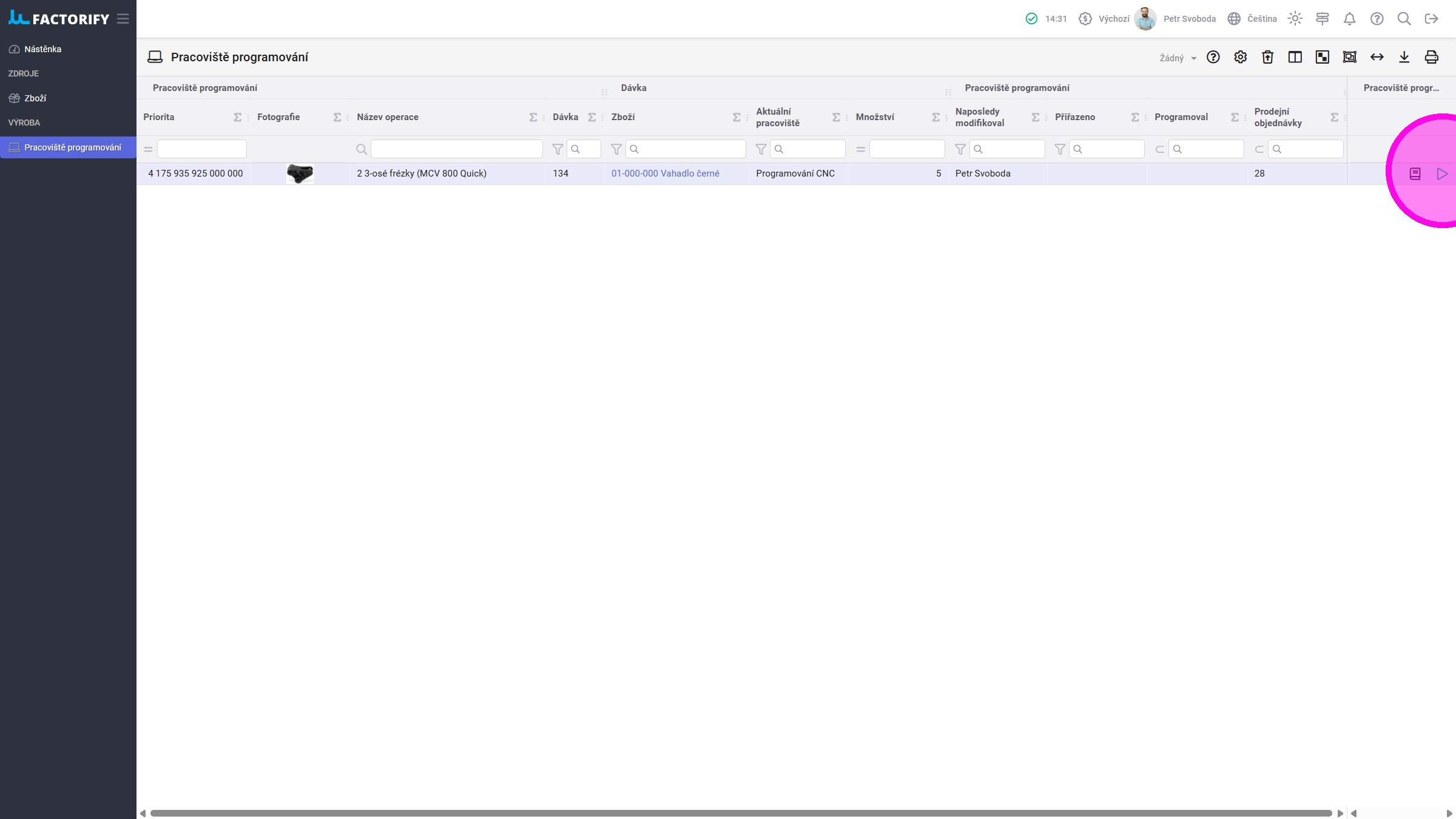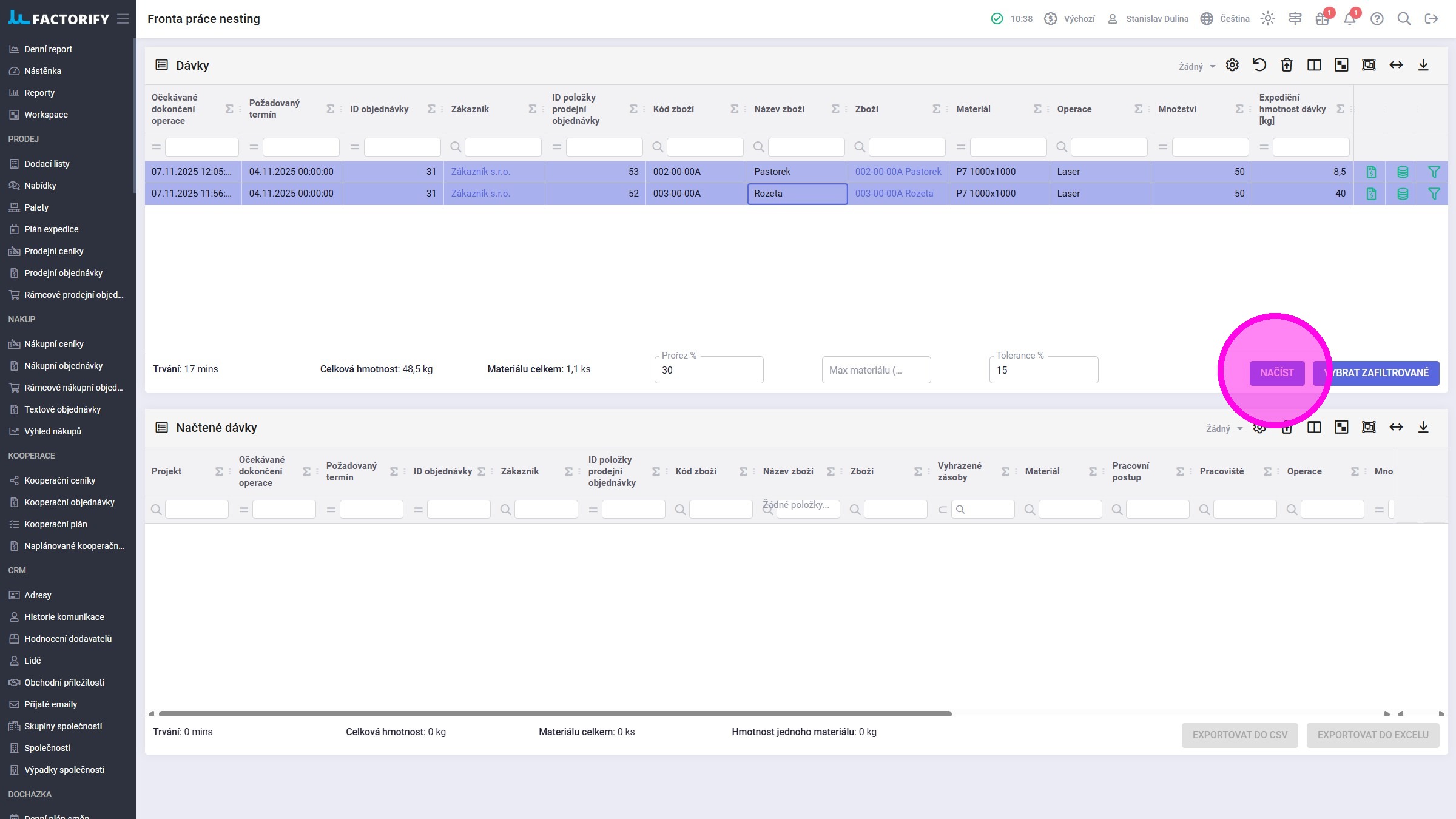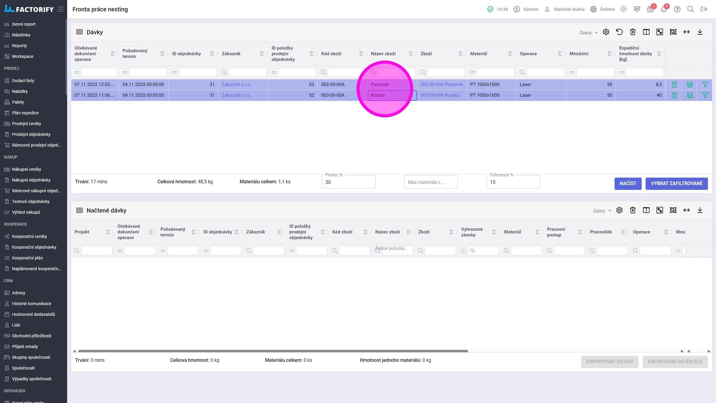 Používané agendy: Dávky, Fronta práce nesting, Pracoviště programování, Zboží