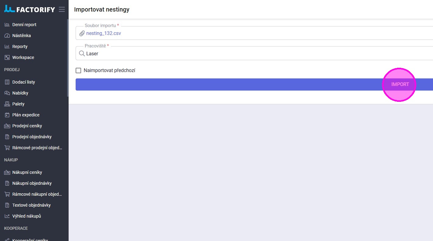 5. V agendě "Importovat nestingy" vybrat CSV s příslušným programem, vybrat pracoviště, kterého se program týká a kliknout na tlačítko "Import". V případě, že se chce přehrát jíž dříve nahraný program (vazba je podle čísla programu), je potřeba zatrhnout "Naimportovat předchozí". Tímto jsou vytvořeny dávky na příslušné zboží a množství dle CSV, a vznikne nový nesting.
