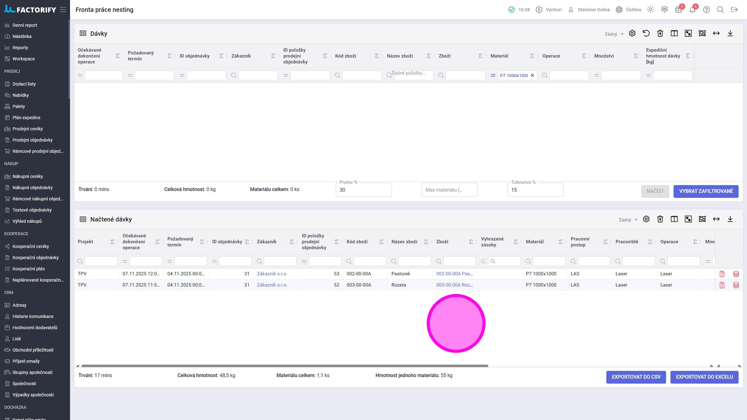 4. Kliknout na tlačítko "Exportovat do CSV" nebo "Exportovat do Excelu", podle toho jaký formát vyžaduje nestingový software.