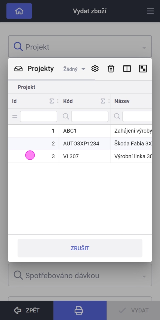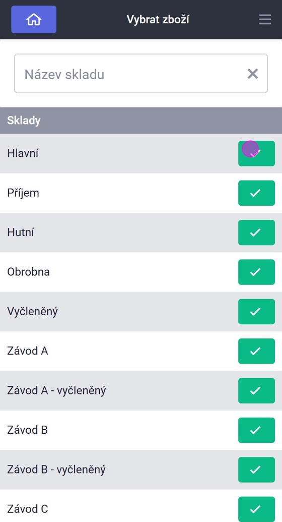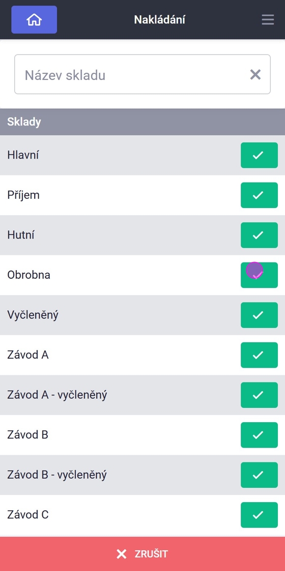 7. Kliknutím na řádek vybrat a potvrdit konkrétní sklad.