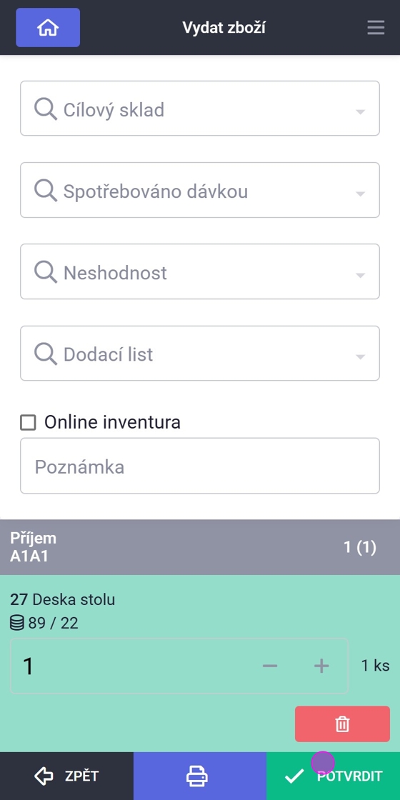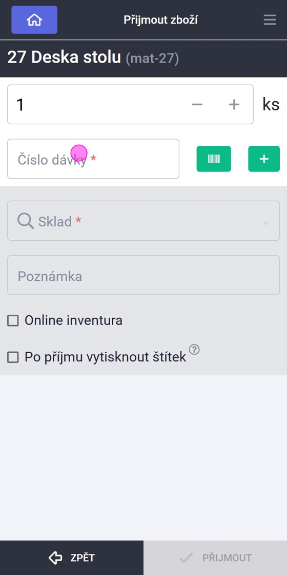 Možnost naskenovat štítek zboží včetně čísla dávky, každé naskenování přidá jednu jednotku množství.