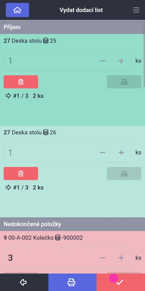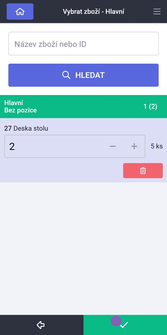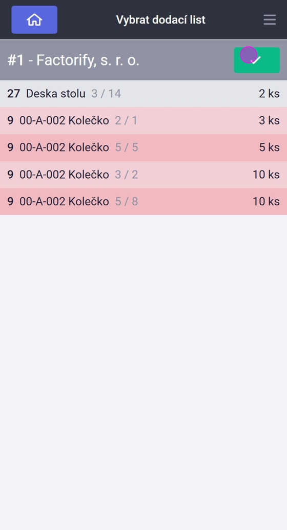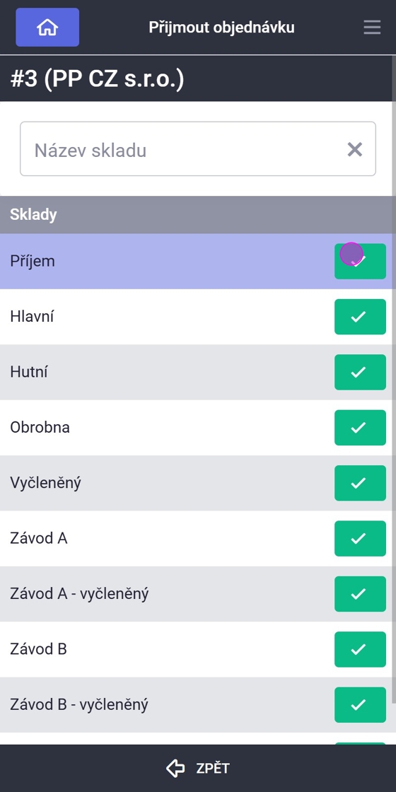 Tip: Pokud je na objednávce nebo její položce vyplněný cílový sklad, je tento sklad v aplikaci modře podbarven. Takové položky je možné vyložit pouze na tento sklad.