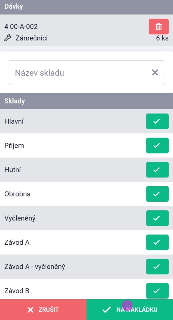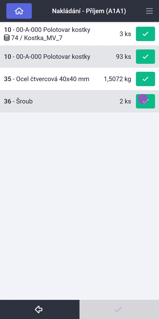Lze využít skenování štítku, kdy každé naskenování přidá jednu jednotku množství, nebo některého z tlačítek "Vybrat vše" a "Naložit vše z vybraných položek".